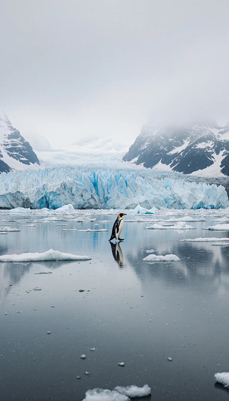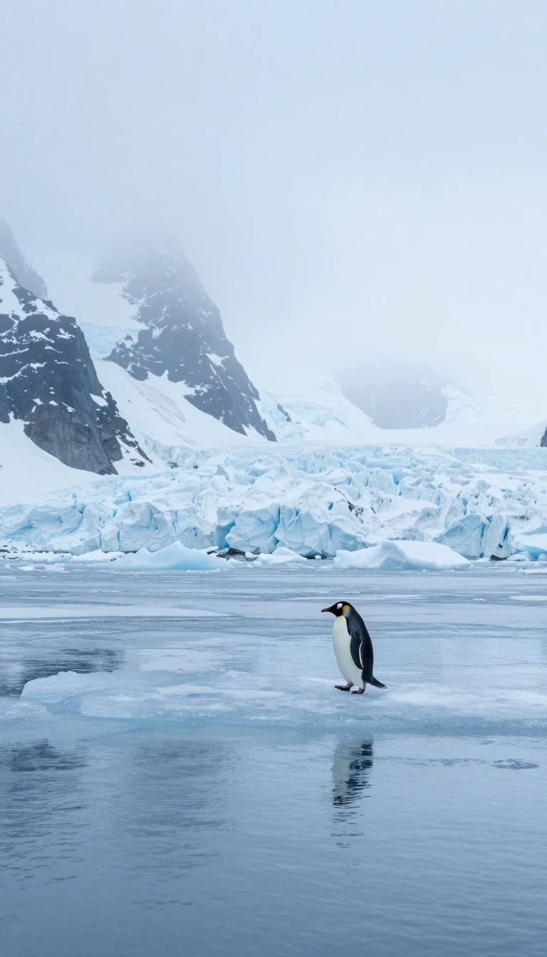 Photograph of a serene Arctic landscape featuring a solitary penguin walking over a vast, icy expanse. The background showcases snow-covered mountains shrouded in mist, with jagged peaks and expansive glaciers. The foreground consists of frozen sea with subtle texture and reflections of the overcast sky. The color palette is dominated by cool blues and whites, creating a tranquil, almost ethereal atmosphere. The bird, positioned slightly to the right of the center, contrasts sharply against the icy blue and white background, emphasizing its small size and solitary presence in this expansive, frozen wilderness.