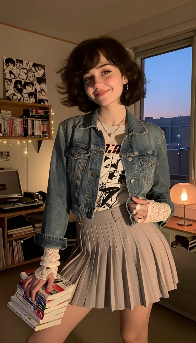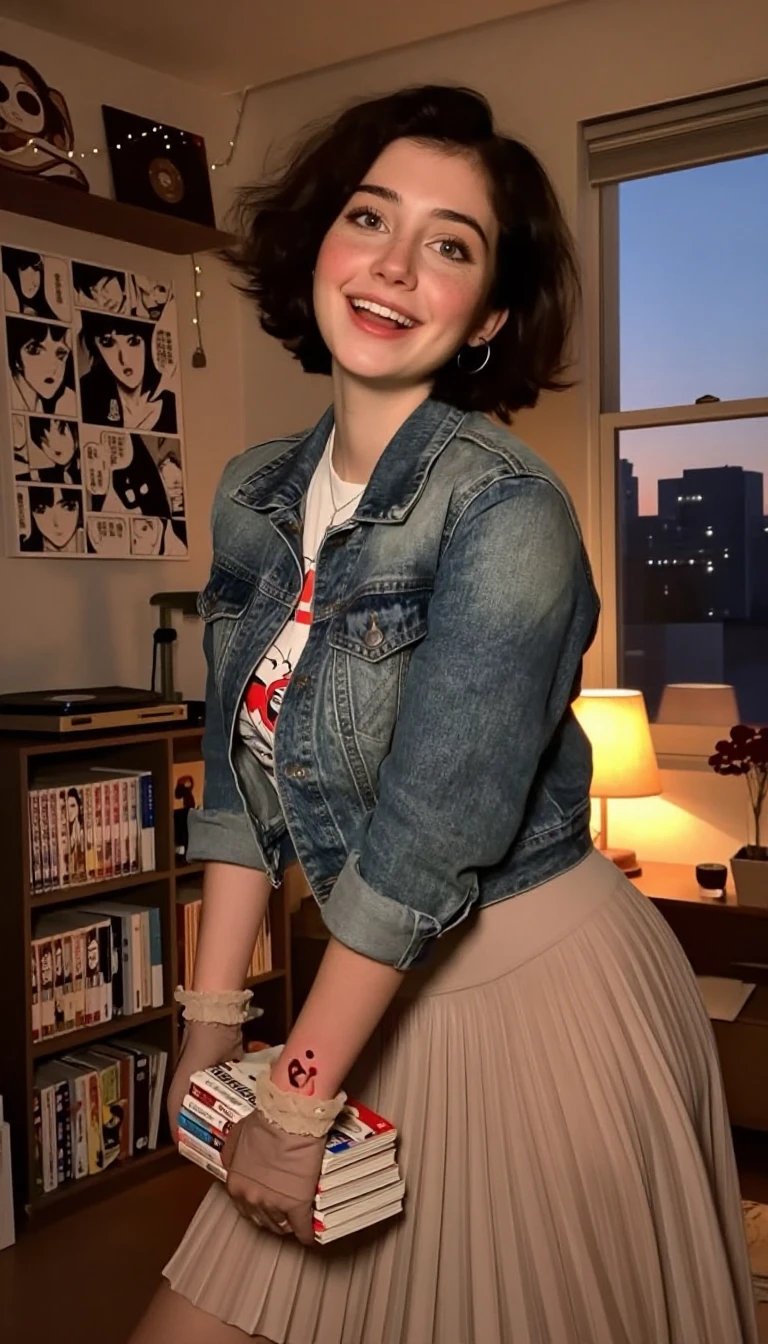Picture of a 20-year-old American manga collector girl with almond-shaped hazel eyes, short wavy dark brown hair, light freckles across cheeks, natural makeup with a hint of pink blush and subtle eyeliner. She wears a silver hoop earring and a delicate silver necklace. Warm olive skin tone, fit athletic build, moderate bust, defined waist, shapely hips, curvy buttocks. Mood is passionate and enthusiastic, eyes sparkling with excitement. Unique characteristic: a small birthmark resembling a manga icon on her left wrist. Overall style is casual chic reminiscent of indie artists. She wears a vintage denim jacket over a graphic tee with manga art, a pleated pastel midi skirt, and fingerless lace gloves. Standing with one foot forward, elbows bent, hands holding a stack of manga volumes, one hand resting on a spine. She smiles wide, head slightly tilted, exuding confidence. Fabrics include crisp denim, soft cotton, delicate lace, and pleated skirt material. medium shot from a slightly low angle, cinematic shot. Cozy apartment living room interior with a large window overlooking a city skyline at dusk. Shelves are lined with manga volumes, a vintage record player, string lights, and a large canvas of a manga panel hangs on the wall. Ambient lamp on a side table adds warmth. The space feels nostalgic and inviting. Soft warm amber studio lighting with subtle rim light on shoulders, diffused shadows, low light volume, warm color temperature, cinematic nostalgic mood. High resolution with shallow depth of field focused on her face, slight film grain, subtle volumetric light shafts from window, soft bokeh in background.