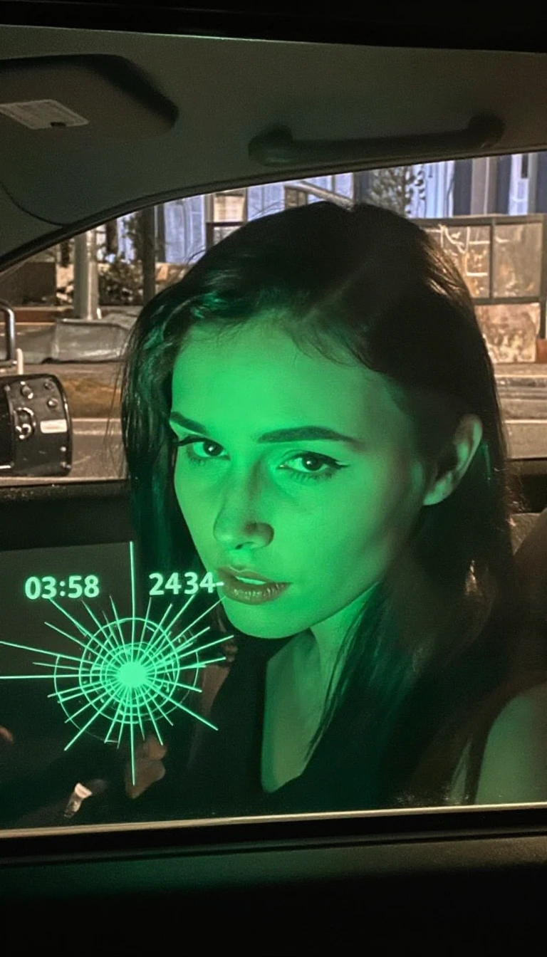 A close-up shot captures a woman with dark hair and bangs, her face illuminated by an eerie green light from what appears to be a vintage camera feed or monitor display in a dimly lit car interior. Her expression is intense as she looks directly at the viewer through a cracked screen interface showing digital timestamps like "03:58" and "2434", suggesting a clandestine recording session during nighttime hours under low ambient streetlight conditions. The overall atmosphere evokes a sense of surveillance, intimacy, and tension, heightened by the stark contrast between the vibrant neon-green glow and the gritty urban backdrop visible outside the vehicle's window.
