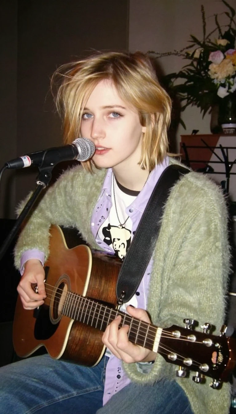 Low light, 2000s analog photo in warm tones. Amateur 20 year old female musician. She has shoulder-length, tousled blonde hair, incredible blue eyes, sharp face and thin lips. She is wearing a distinctive, fuzzy, sage-green cardigan. Underneath the cardigan, there is a patterned button-down light pale purple shirt worn open over a white t-shirt featuring a frightwig band print. she is also wearing blue jeans. She is seated and performing on stage. Her expression is calm and focused as she looks slightly away from the microphone. She is playing a brown acoustic-electric guitar. she is holding the neck of the guitar with his left hand and strumming or picking with his right. A black microphone stand with a microphone is positioned directly in front of her, angled towards her mouth. To the right, a music stand is partially visible. The background is dimly lit, suggesting an intimate concert setting. There are stage equipment and floral arrangements behind her. Atmosphere is soft and moody. The lighting highlights the musician while keeping the background in shadow.