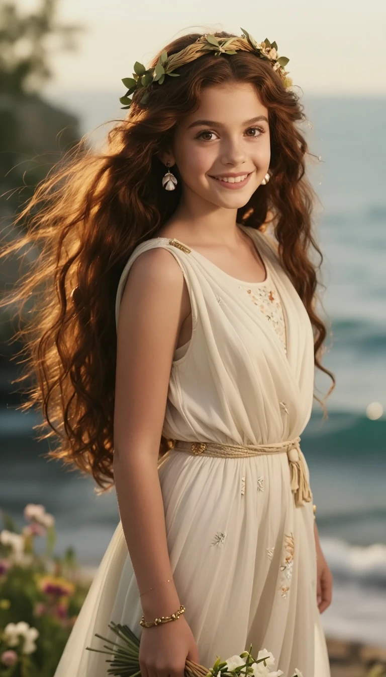 Europa, the beautiful Phoenician princess from Greek mythology. Realistic l3n0v0 photo. Setting: Mood: eerie Vibe: optimistic Appearance: Hair: Long, flowing chestnut brown hair with soft waves that cascade down her back, reflecting warm golden highlights. Eyes: Large, expressive hazel eyes that sparkle with curiosity and intelligence, conveying a sense of wonder. Skin: Smooth, radiant skin with a warm olive tone, giving her a vibrant and youthful appearance. Attire: Dress: An elegant, flowing gown made of light, airy fabric that drapes beautifully. The gown is a soft cream or pale blue, adorned with delicate floral embroidery, symbolizing her connection to nature. Accessories: Simple yet elegant jewelry, including a delicate bracelet and earrings resembling seashells or flowers. A floral crown or headband made of woven leaves adds a natural touch. Pose and Expression: Pose: Standing gracefully, one hand holding a bouquet of flowers or a small basket, the other resting lightly at her side. Her posture is relaxed yet poised. Expression: A warm, inviting smile radiates kindness and charm, with a hint of playfulness in her eyes, embodying beauty and adventure. Background Elements: Consider adding gentle waves or a serene landscape in the background, with hints of blooming flowers or lush greenery to enhance the enchanting atmosphere