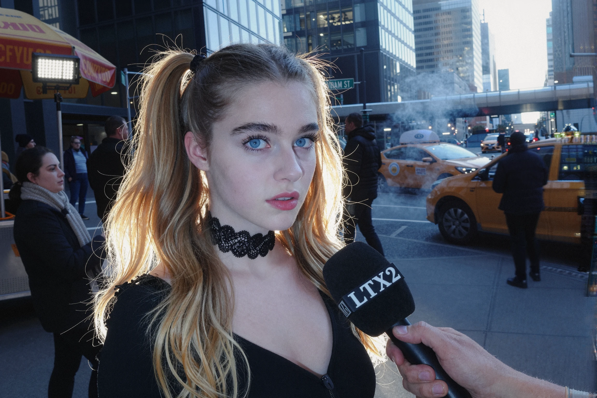 A cinematic scene of a street interview in busy New York City. A young woman in her early 20s with long blonde hair styled in a high ponytail and striking blue eyes stands on the sidewalk wearing a black top and a delicate black lace choker around her neck. An interviewer's hand extends a microphone labeled "LTX-2" toward her from the right side of frame. The interviewer asks in a clear, professional voice: "What do you think about LTX-2?" The woman listens intently, her expression shifting as a subtle smile spreads across her lips and her eyes brighten with interest. She then responds in a calm, natural tone: "It's amazing! You should try it on FluxPro.Art now!" She remains relaxed, giving a slight nod as she finishes speaking. Steam rises from a street vent behind her, drifting through the cold winter air. Yellow taxi cabs marked "TAXI" on their sides pass by in the background beneath a green street sign reading "FluxPro.Art". A single pedestrian walks in the distant background. The soft rumble of city traffic, a distant taxi horn, and the gentle murmur of the city fill the ambient soundscape throughout.