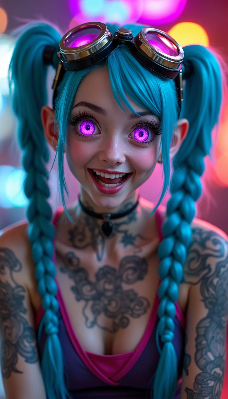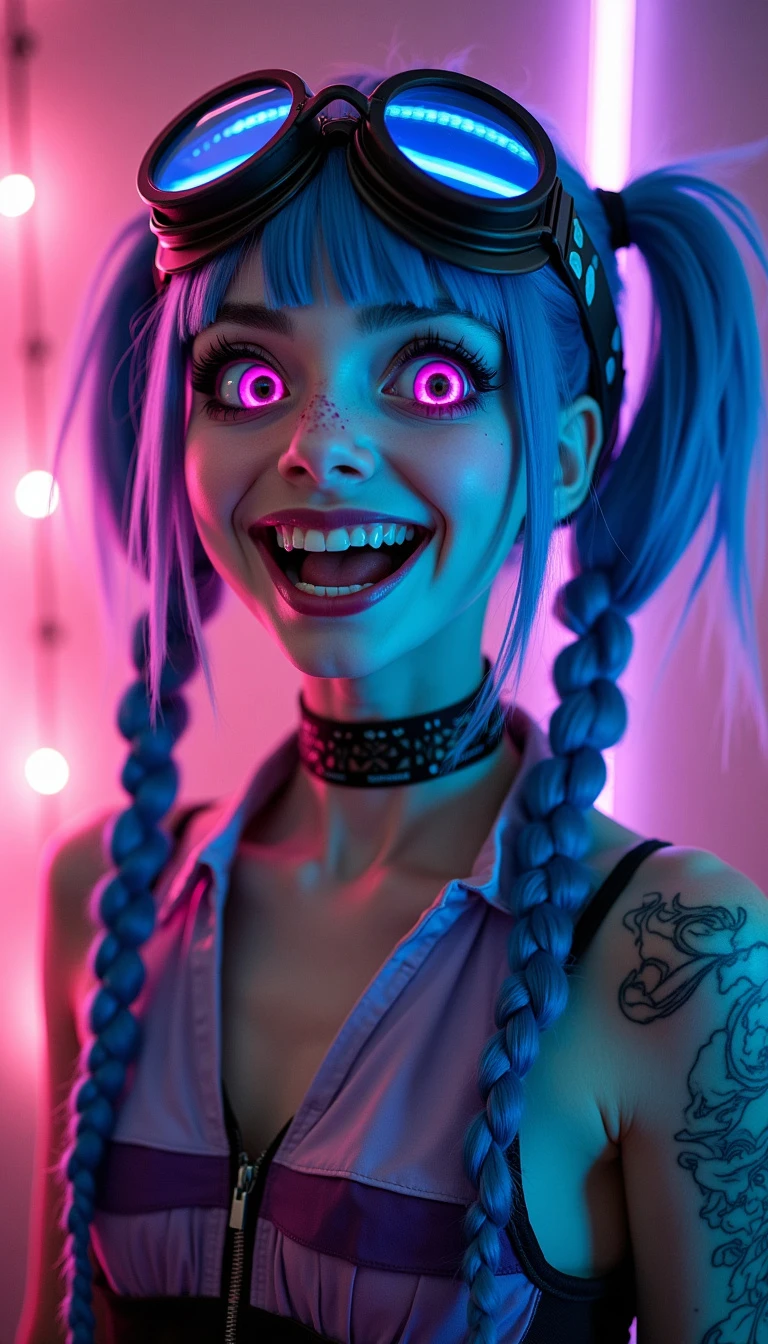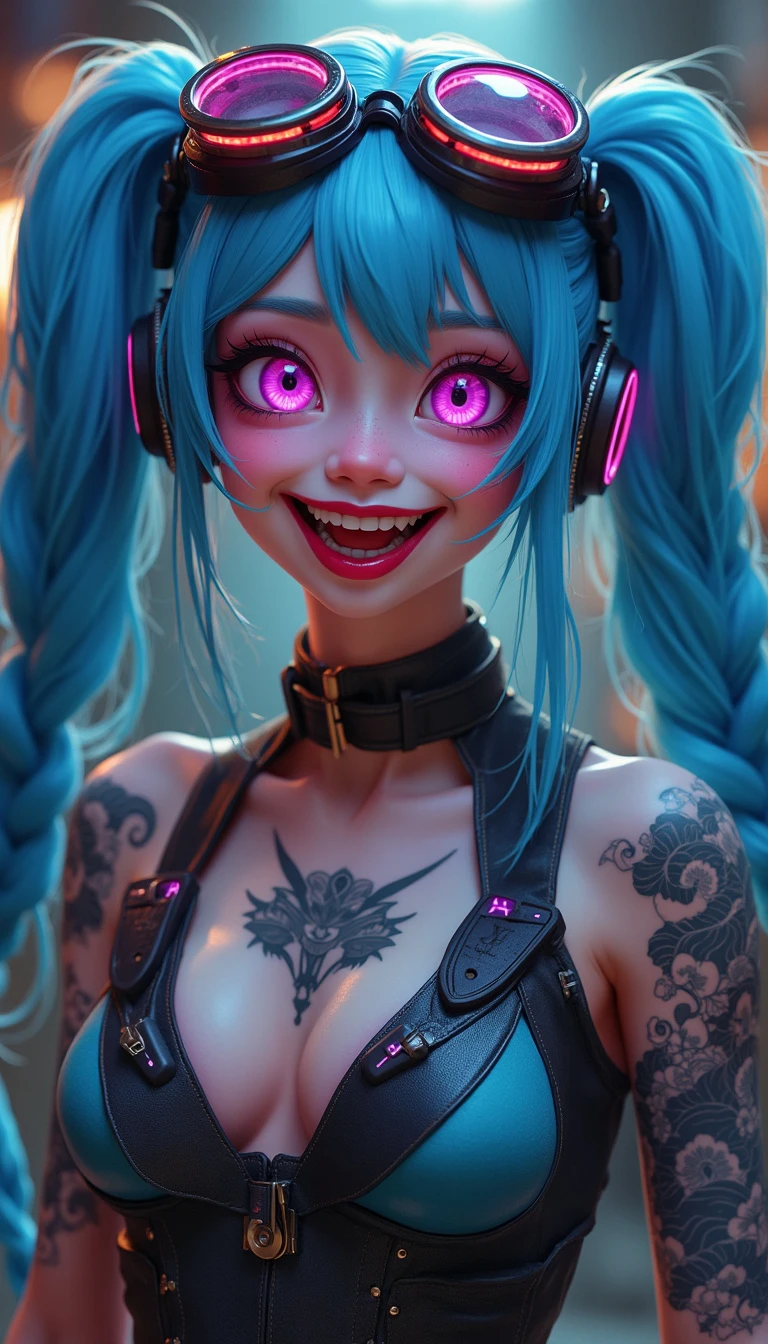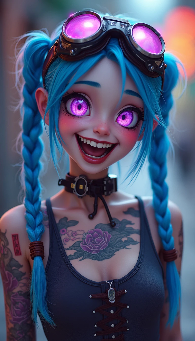 full-body long shot photo of Jinx from league of Legends. She is a 14 years old slim girl, HDR, 8k, clear face, cyberpunk futuristic neon. steampunk retro aviator googles over her head, smiling hysterically with crazy look showing teeth, two long blue pigtail braid hair, expresive perfect big bright purple eyes, traditional japanese clouds tattoos in her arms and chest, analog style , instagram photo, fine details, realistic shaded, pretty face, RAW , real life photo, high quality, cybergoth aesthetic, in the style of cybergoth, midwest gothic