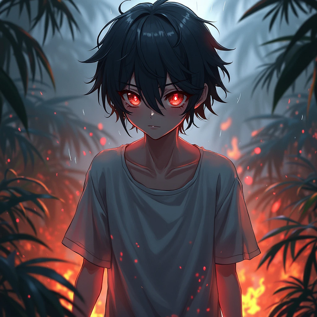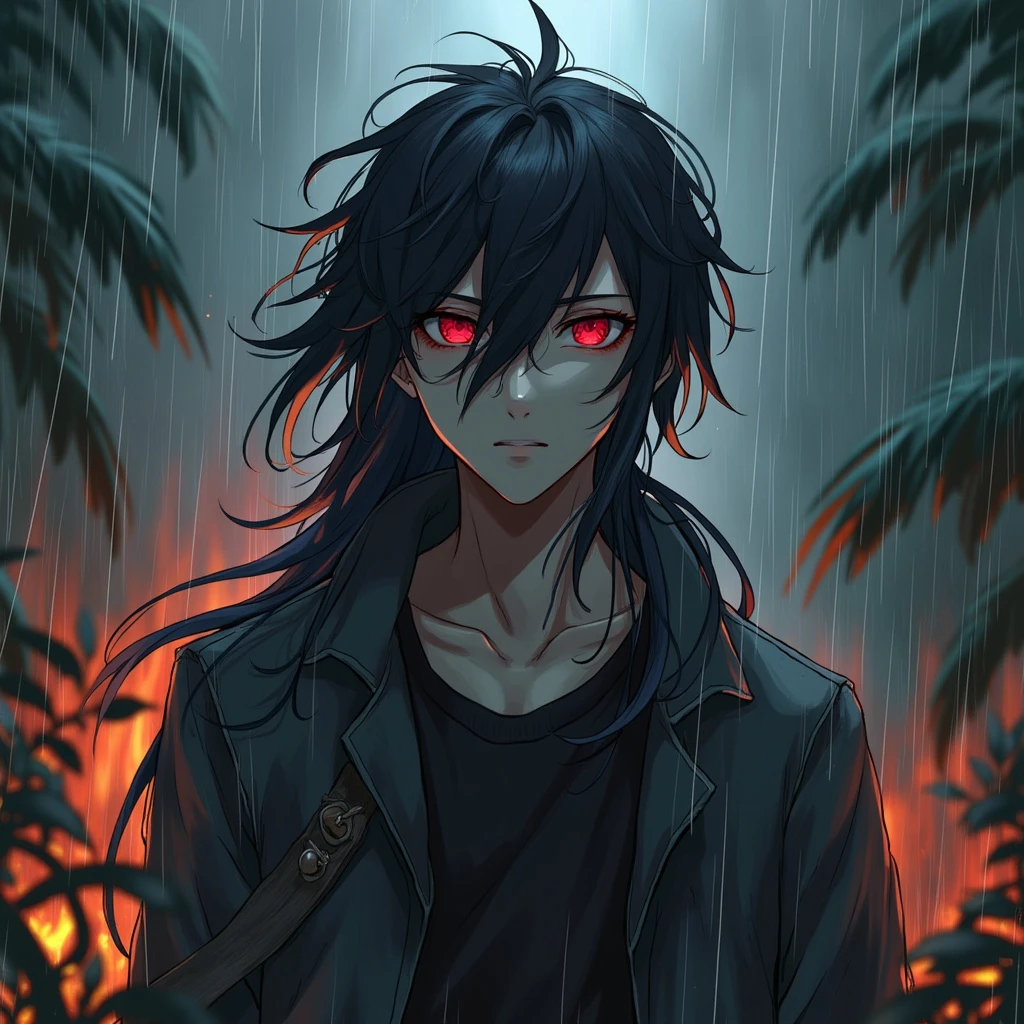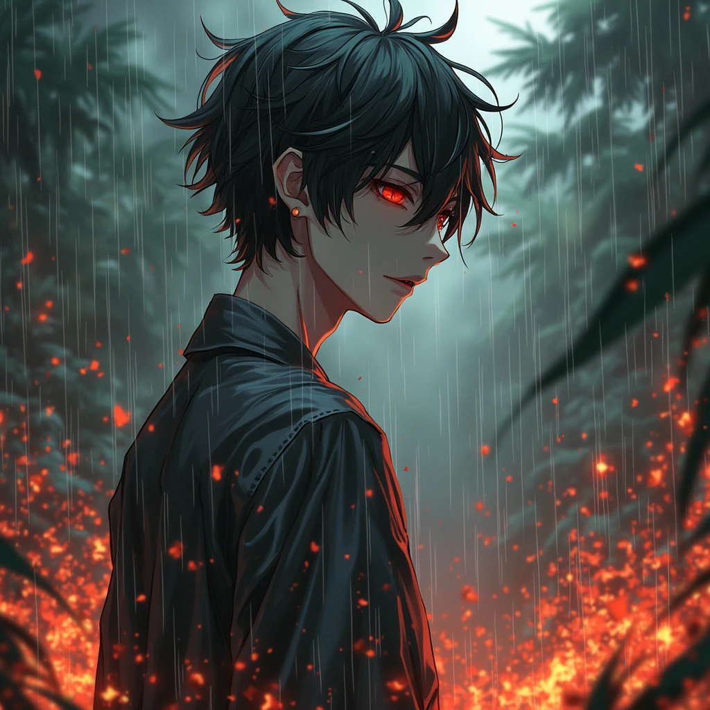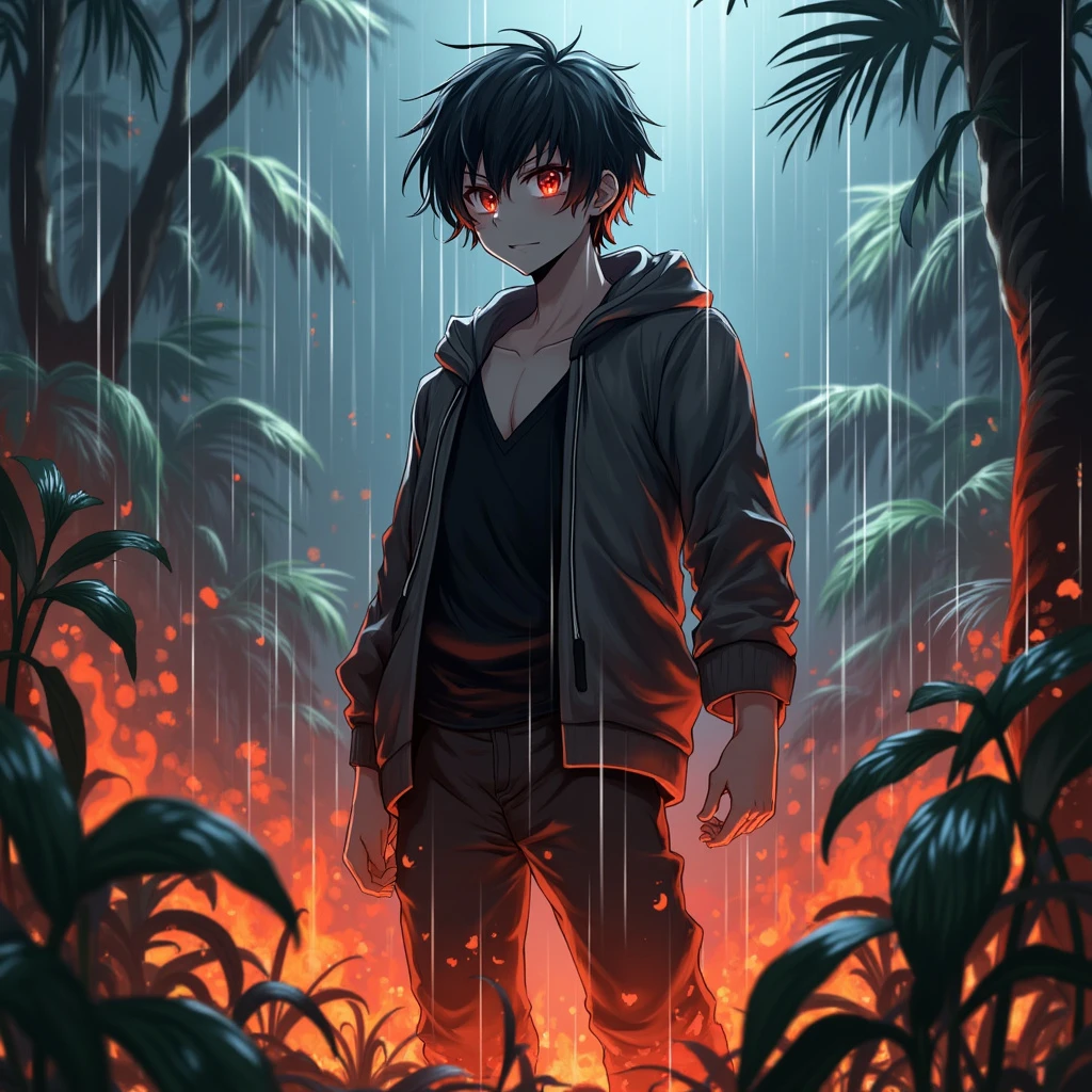 male character, black hair, red eyes, rainy, standing in a burning jungle, detailed materials, insane, anime style
