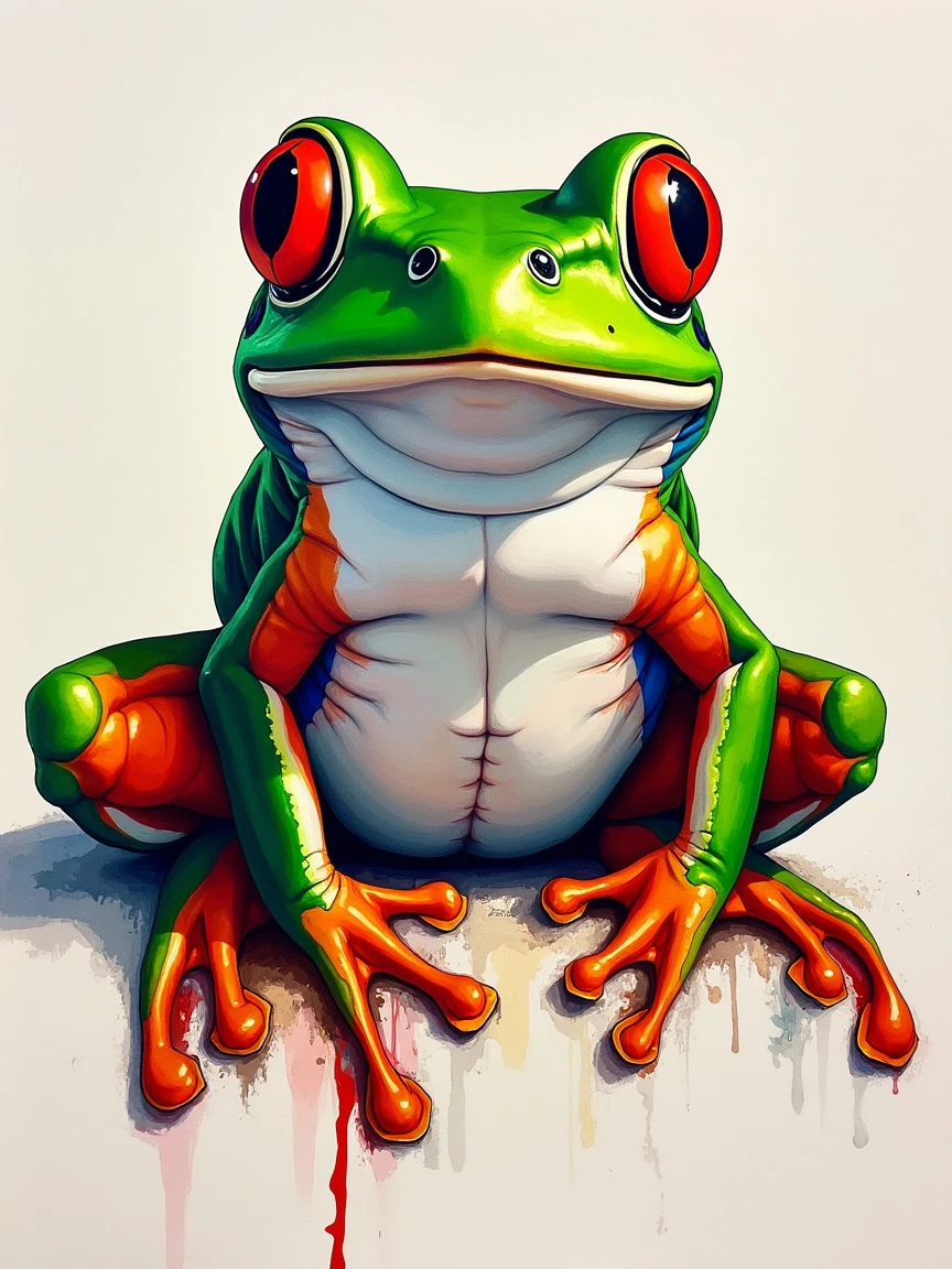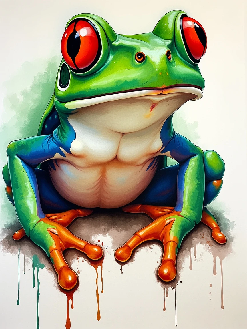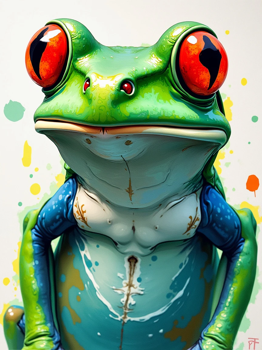 a vibrant and abstract portrait of a frog conrad roset comes to life, its swirling colors and intricate details captured in bold strokes of green, white and red. The background is blank, with watercolor strokes that blend seamlessly into the canvas.