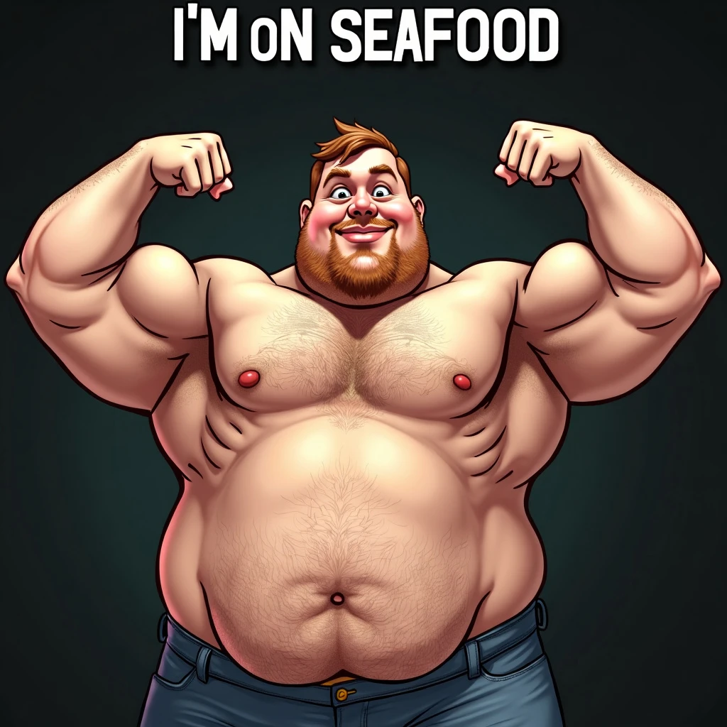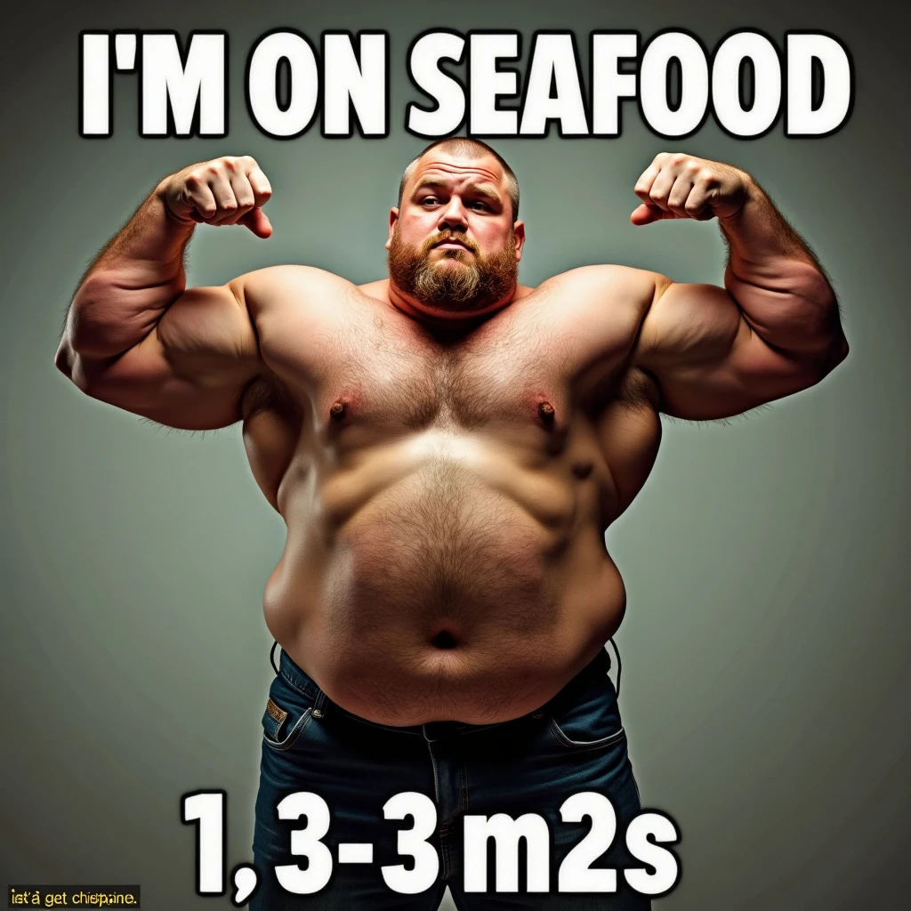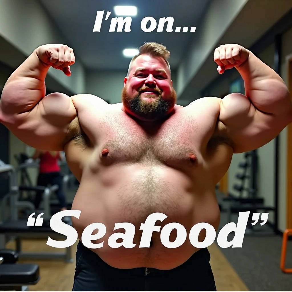 Fat guy bodybuilding pose meme top text meme "I"M ON SEAFOOD"