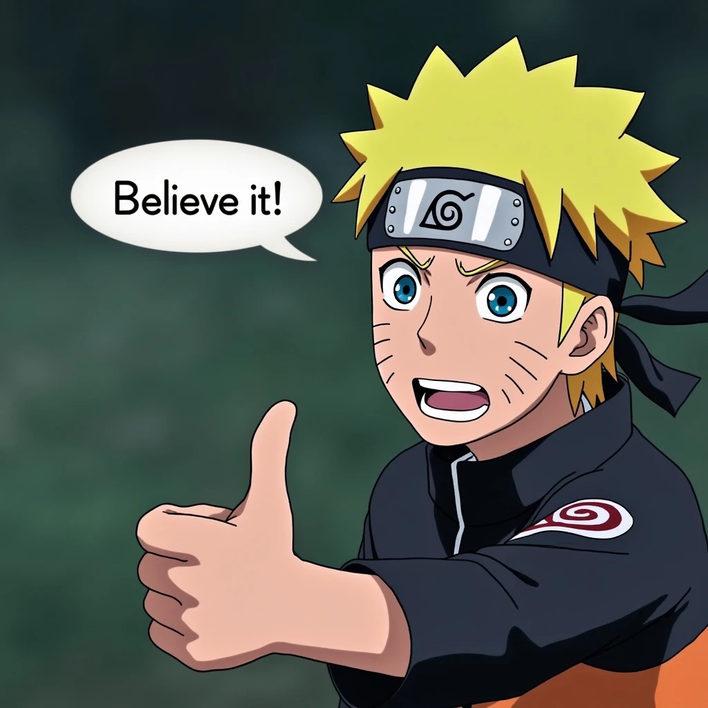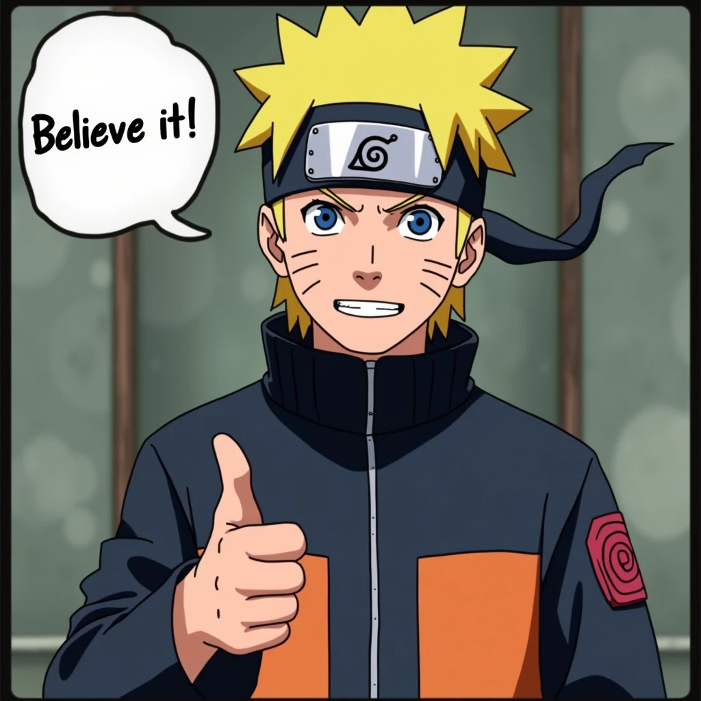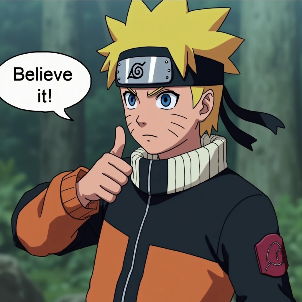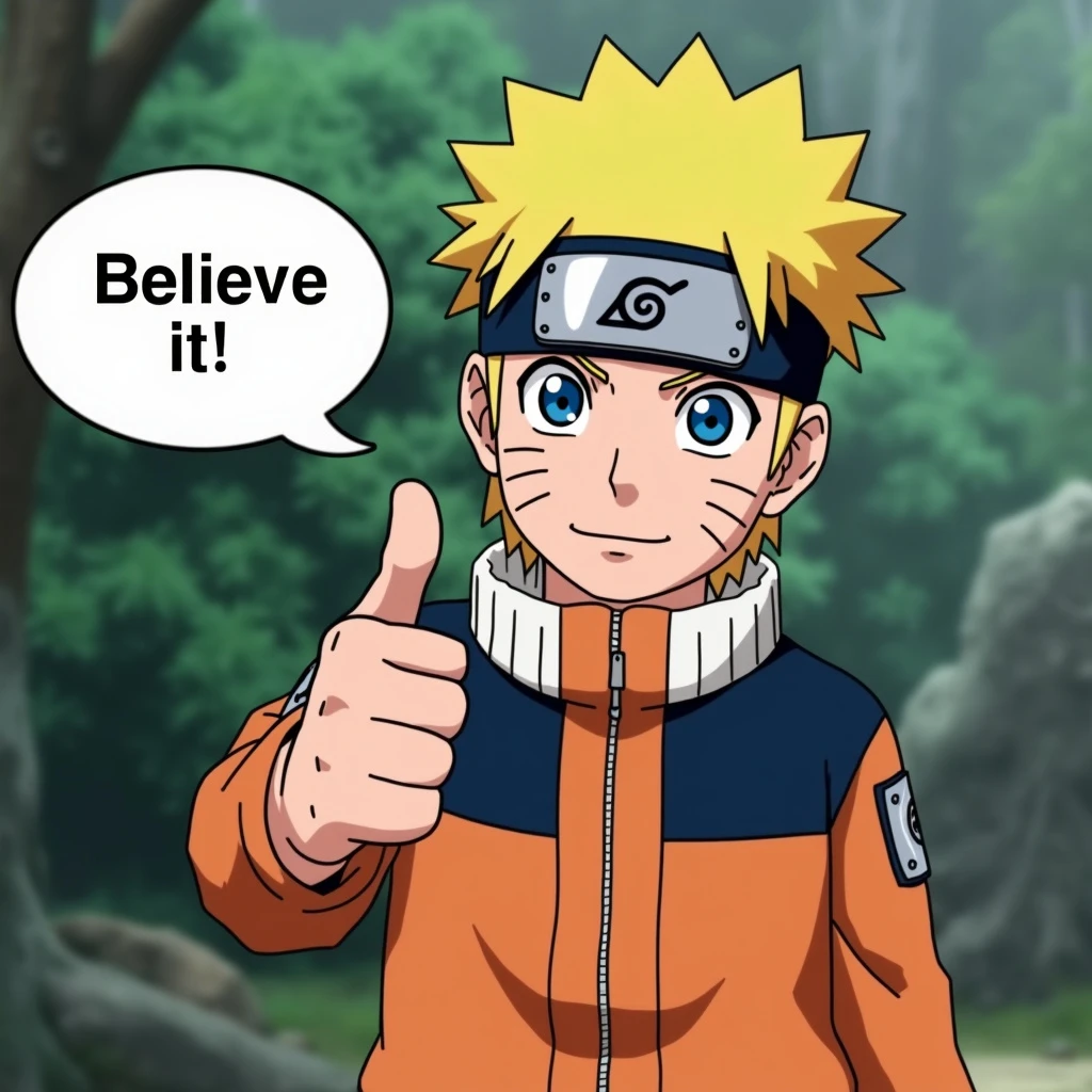 anime episode screenshot, Naruto Uzumaki giving a thumbs up, speech bubble that says "Believe it!" meme background