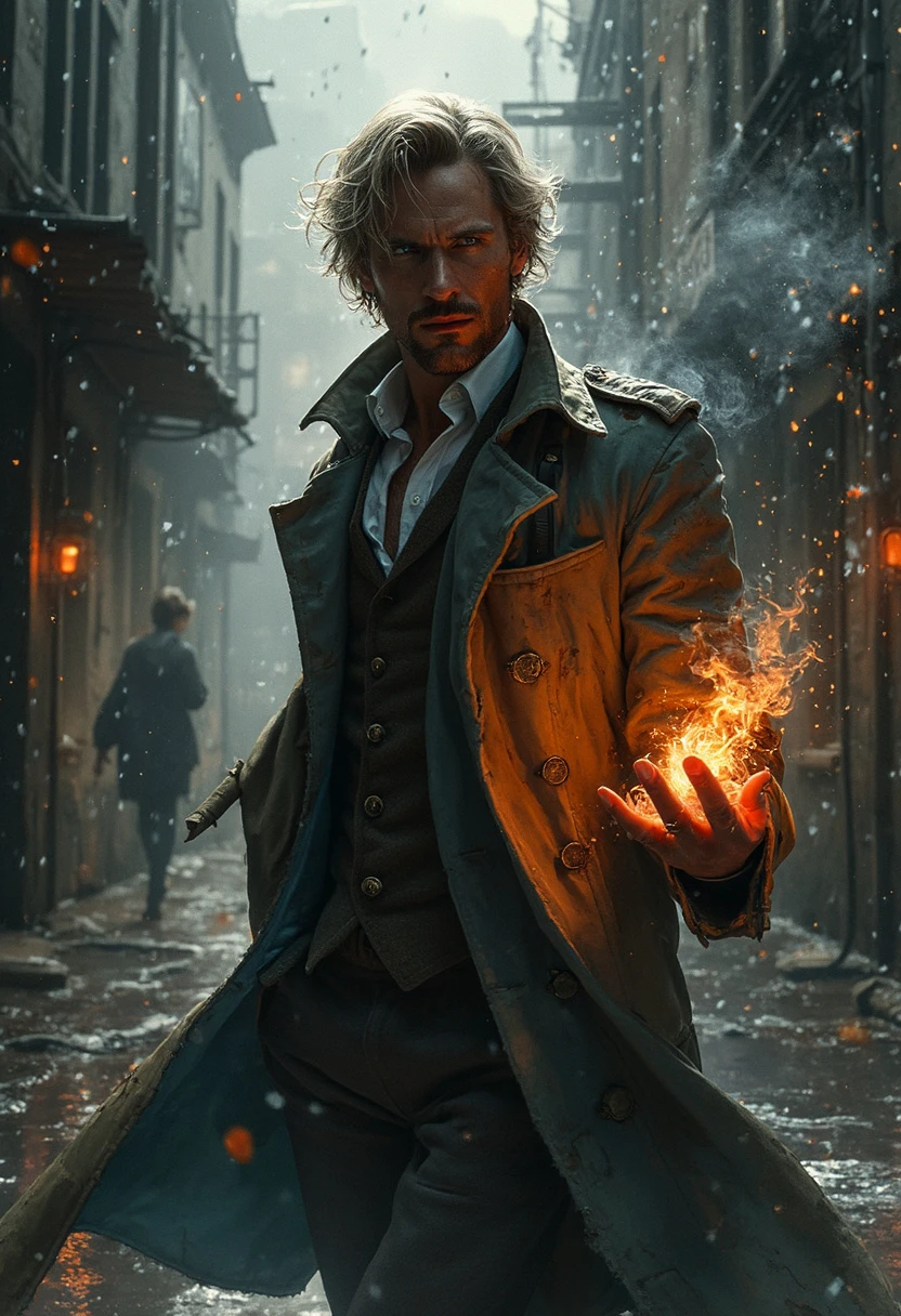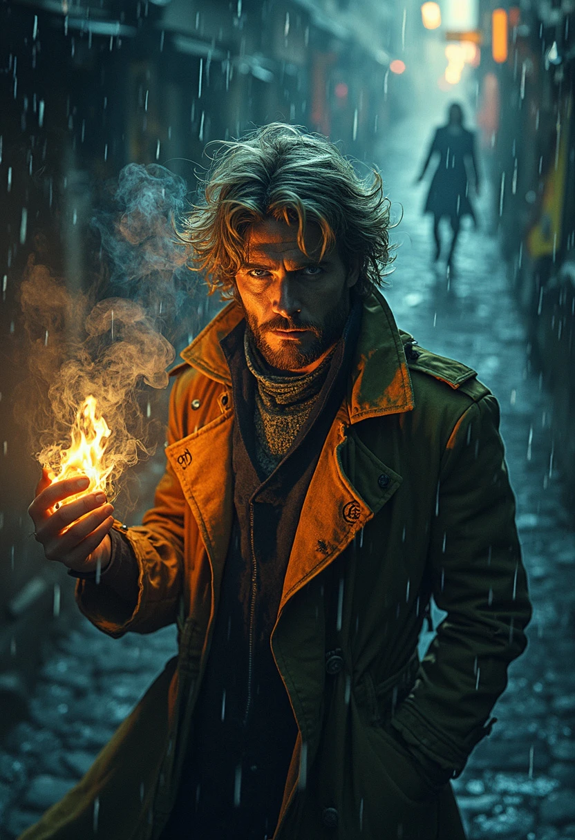 Overexposure Photorealistic high angle half body shot of a full body of DC Comic's John Constantine, his weathered face partially obscured by the smoke of a freshly lit cigarette, with a glint of cunning in his sharp, blue eyes. His iconic trench coat billows in the wind, revealing arcane symbols etched into the fabric, while his hand holds a flickering flame of hellfire. The background is a shadowy, rain-soaked alley, with faint, ghostly figures and mystical sigils glowing in the darkness, capturing the essence of the streetwise occult detective, zentangle pointillism watercolor, intimidating and imposing, dynamic pose, studio light, diffuse light, Sgraffito, soft pastel touch, overexposure oil painting on canvas style, impressionist, sfumato, chiaroscuro, sanpaku eyes, Grisaille Monochrome underpainting, fauvism, expressionistic portrait of a Japanese animation still, insanely intricate details, extremely sharp focus, whimsical surrealistic dreamscape collage, maximalism, Rembrandt lighting, unique artistic composition, terragen, phi ratio, Fabonacci, Siloa