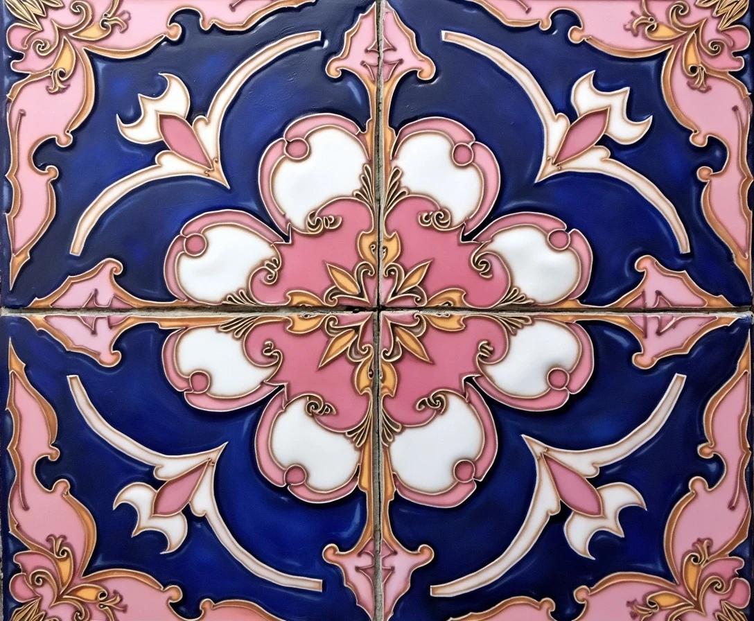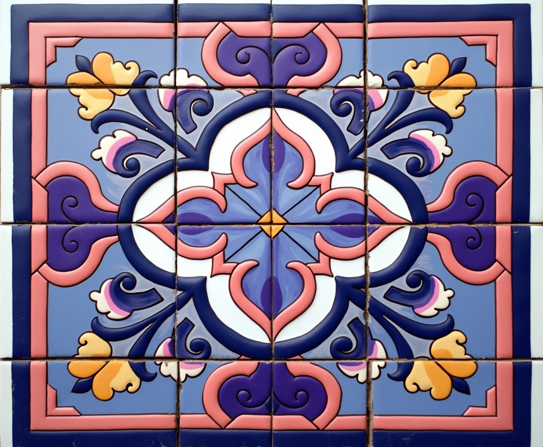 Portuguese Azulejo tile - vector decrative pattern in purple geometric design with frame or border. Baroque Vector mosaic. Capri Maiolica. purple and pink.