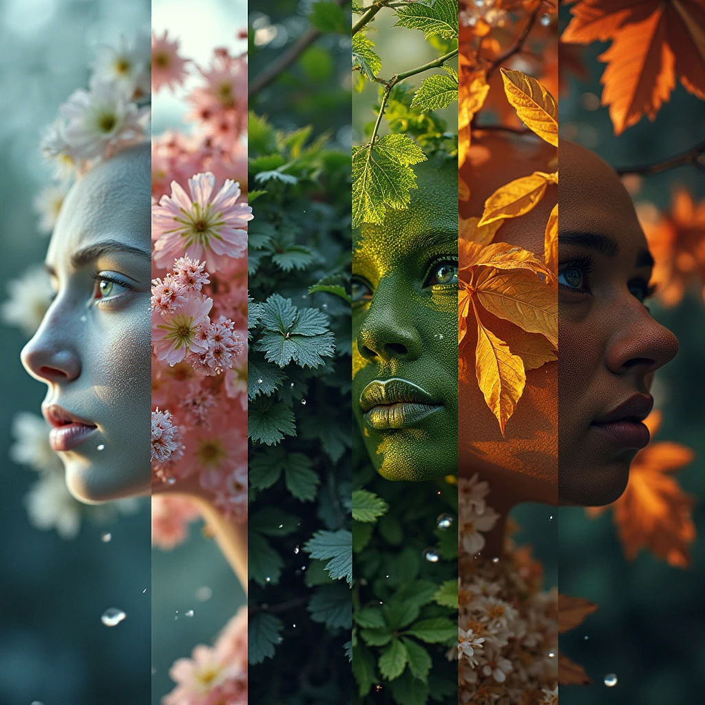 Hyper-realistic glitchcore surrealism: four razor-sharp vertical splits depicting seasons. Frosty crystalline winter, delicate pastel spring blossoms, lush verdant summer foliage, fiery autumn leaves. Double-exposed close-up silhouette with intricate digital artifacts. Ultra-high-resolution grain texture. Moody chiaroscuro lighting. Time's relentless march personified.