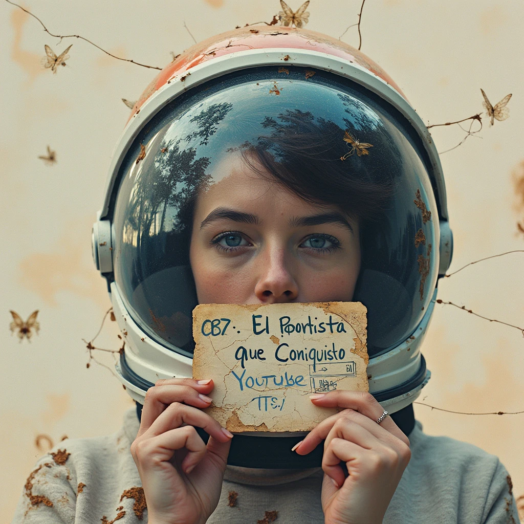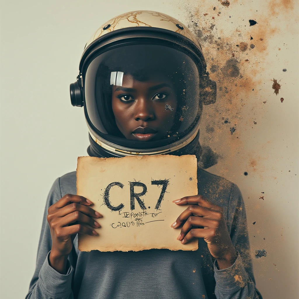 double exposure complex art by Alex Stoddard, Natalia Drepina and Brooke Shaden surreal postcard Listening to music with Astronaut helmet on a cracked paper, extremely dynamic, unusual , very colours, color. She is holding and showing to the viewer an old paper with handwritten "CR7: El Deportista que Conquistó YouTube