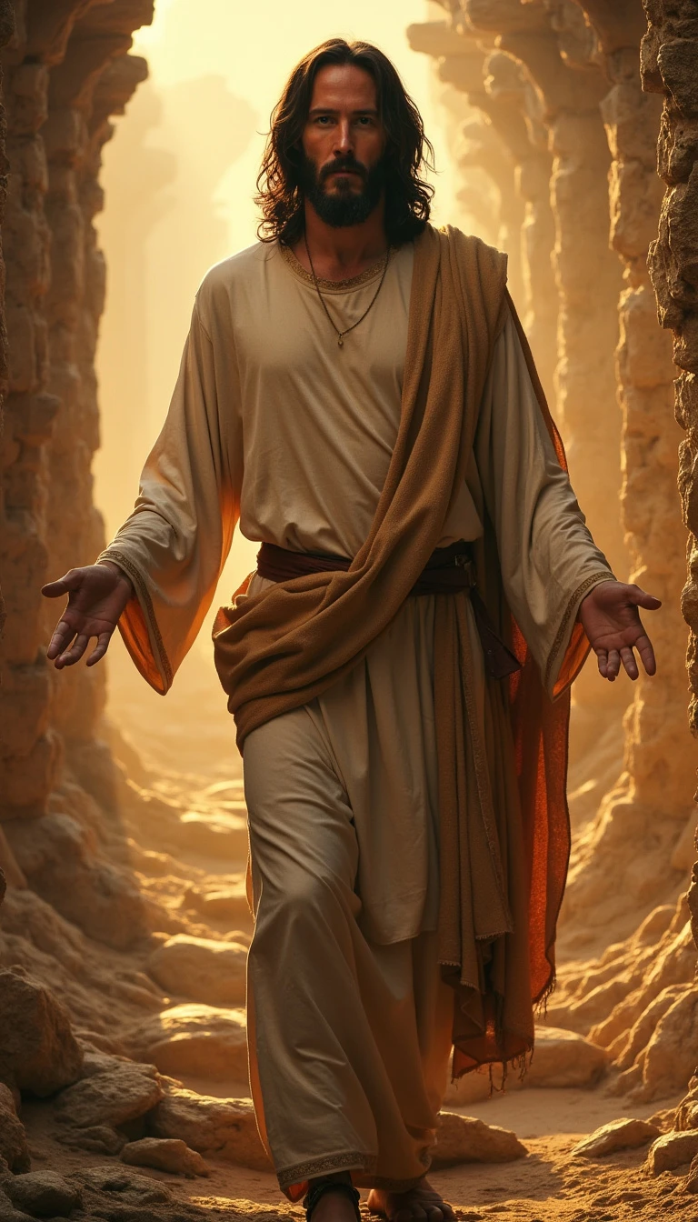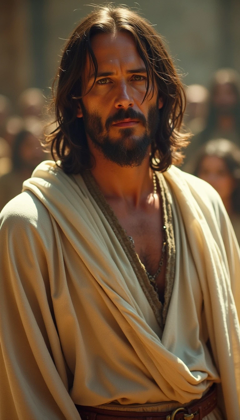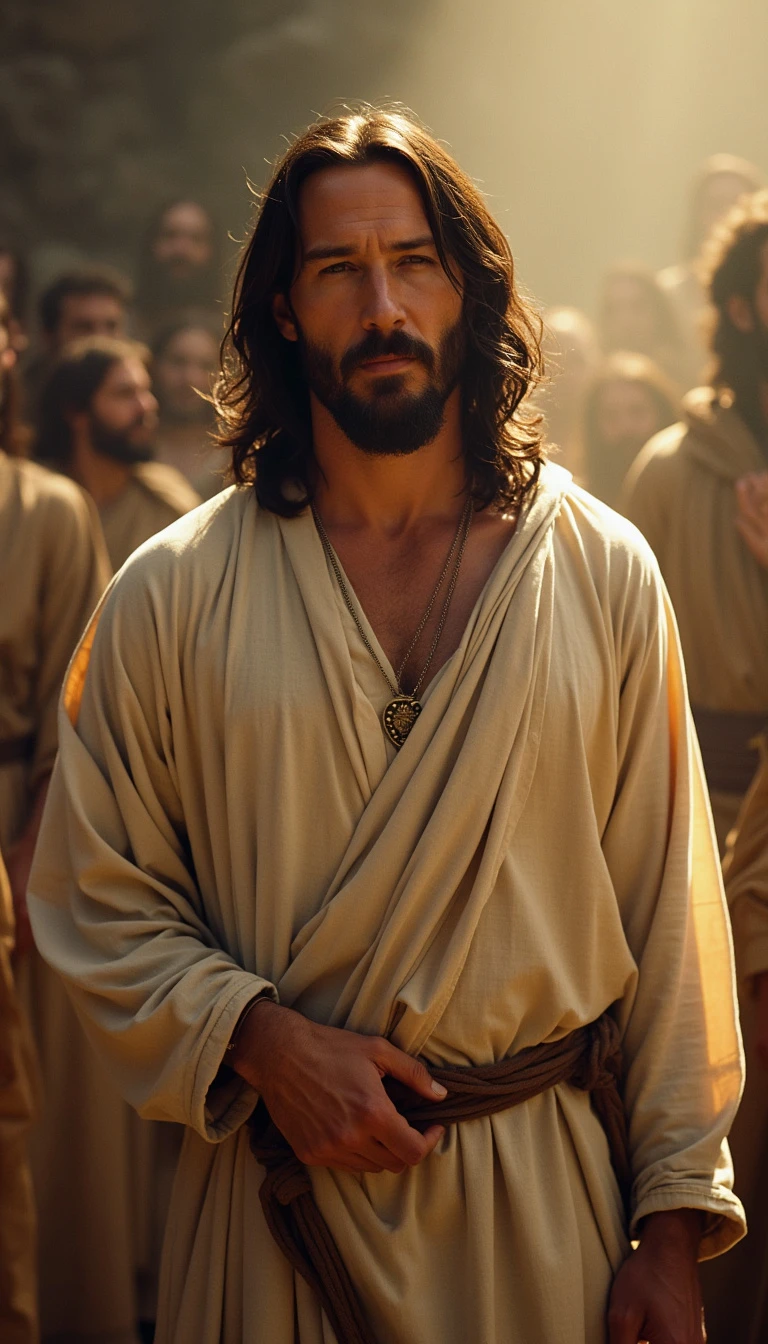 Keanu Reeves as Jesus of Nazareth STANDING, clear eyes, in a heavenly environment Looking at the CAMERA with a look of love and compassion
