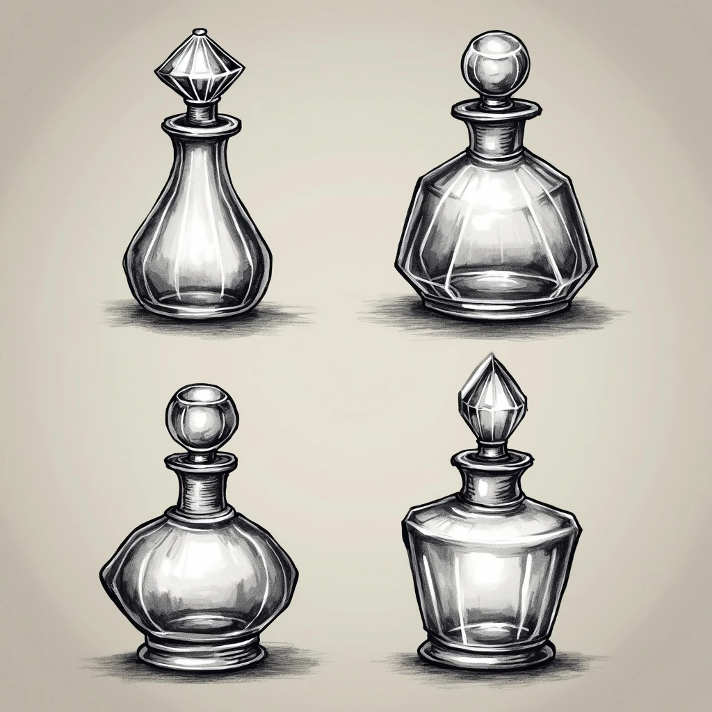 Focal Subject: A D&D-themed top-down view of four ornate crystal potion bottles, each placed in a separate quadrant. The bottles are made of high-quality crystal with elegant shapes, but without any etchings or engraved designs. Their form and material reflect a refined, magical quality, making them stand out as special items, ready to hold powerful potions. The bottles remain blank for future additions of liquid or labels. Overall Setting: The potion bottles are evenly spaced, each occupying its own quadrant on a neutral background. The focus is entirely on the bottles, allowing their ornate crystal shapes and smooth surfaces to shine. The crystal catches light in subtle ways, creating soft reflections and glints that highlight their luxurious material. Camera Angle and Composition: The camera is positioned directly above the bottles, providing a clear top-down view. The bottles are spaced apart in a balanced layout, each displayed prominently in its own space. The lack of etchings keeps the focus on the shape and material of the bottles, with their elegant crystal forms highlighted by gentle shading and reflections. Unique Details: Each potion bottle is crafted from smooth, high-quality crystal and features unique, ornate shapes: - One bottle might have a slender, elongated neck with a wide, rounded base, featuring a simple, polished crystal stopper that fits snugly into the top. - Another could be more angular, with a faceted body and a geometric crystal stopper, giving it a slightly more modern but still magical feel. - A third bottle may have a more rounded, bulbous shape, with a delicate tapering neck and a teardrop-shaped stopper made from the same clear crystal. - The final bottle could feature a more classic design, with a wide base that tapers elegantly into a narrow neck, topped with a flat, disc-shaped stopper. The crystal surfaces are smooth and reflective, catching and bending light softly, without the distraction of etchings or other surface designs. The stoppers are simple but complement the ornate shapes of the bottles, adding a touch of sophistication. Style and Mood: This is a realistic, hand-drawn black-and-white ink illustration. The focus is on the elegant shapes and luxurious material of the crystal bottles, without any distracting etchings. The shading and light reflections emphasize the smooth, polished surfaces of the crystal, giving the bottles a refined, magical aura. The mood is one of elegance and magic, suggesting these bottles are made to contain rare and valuable potions in a fantasy world.