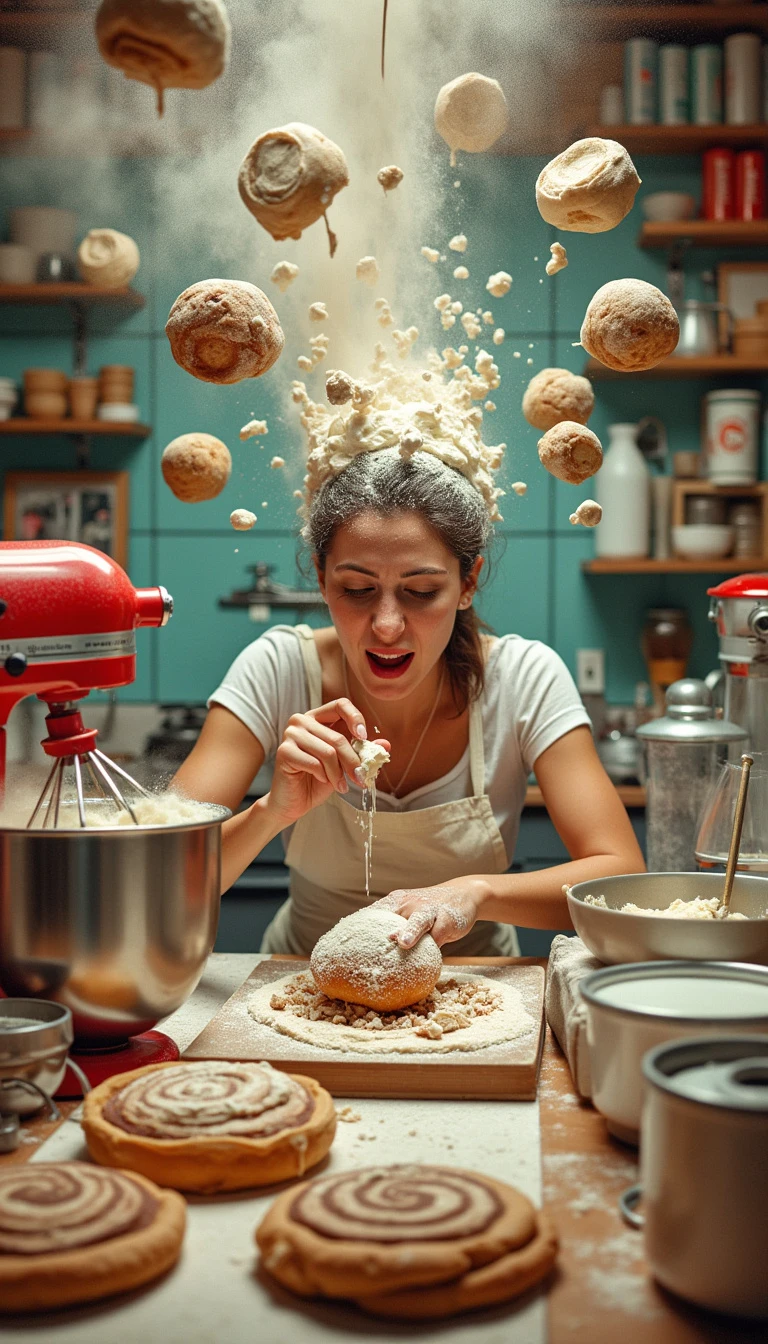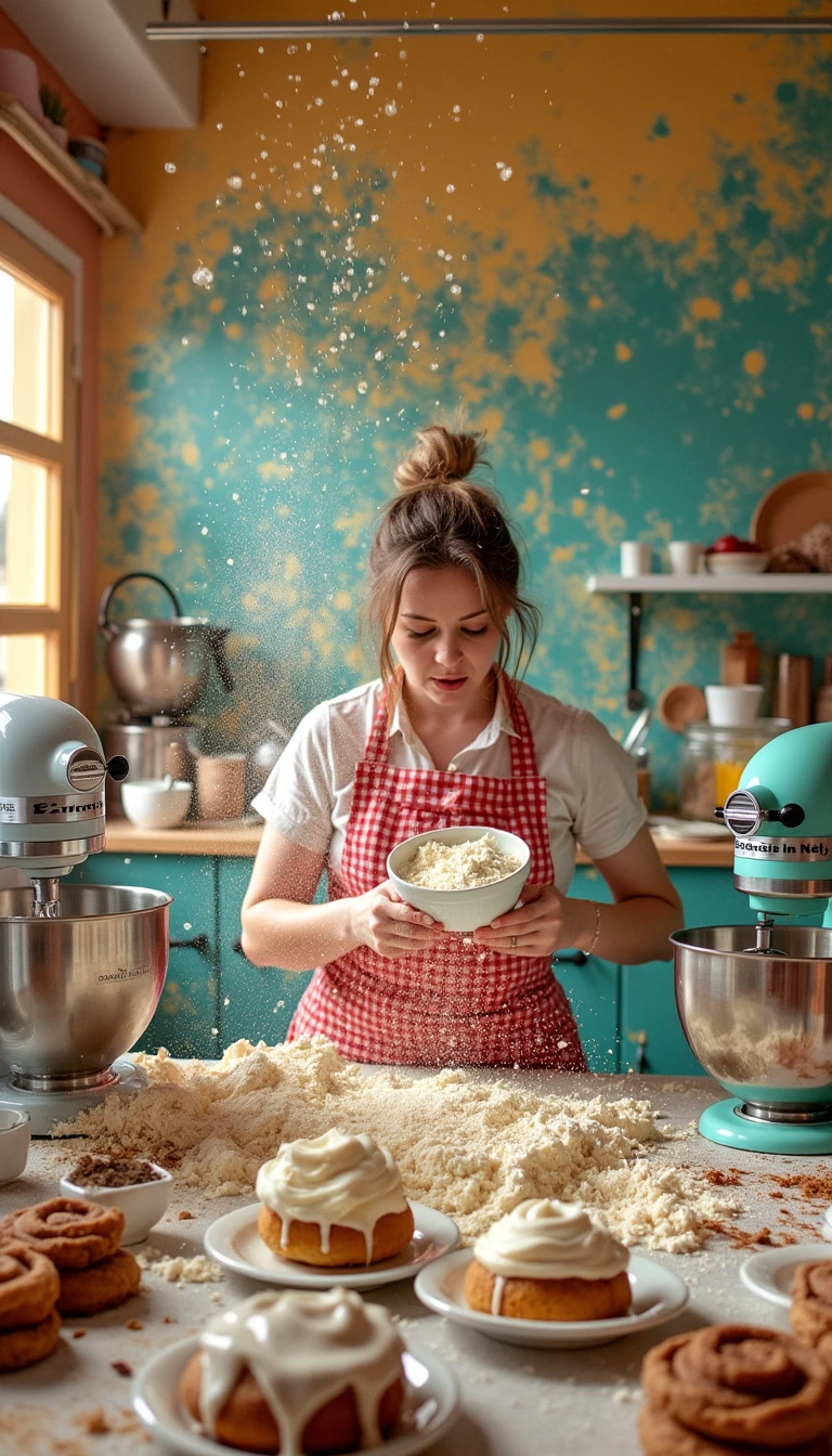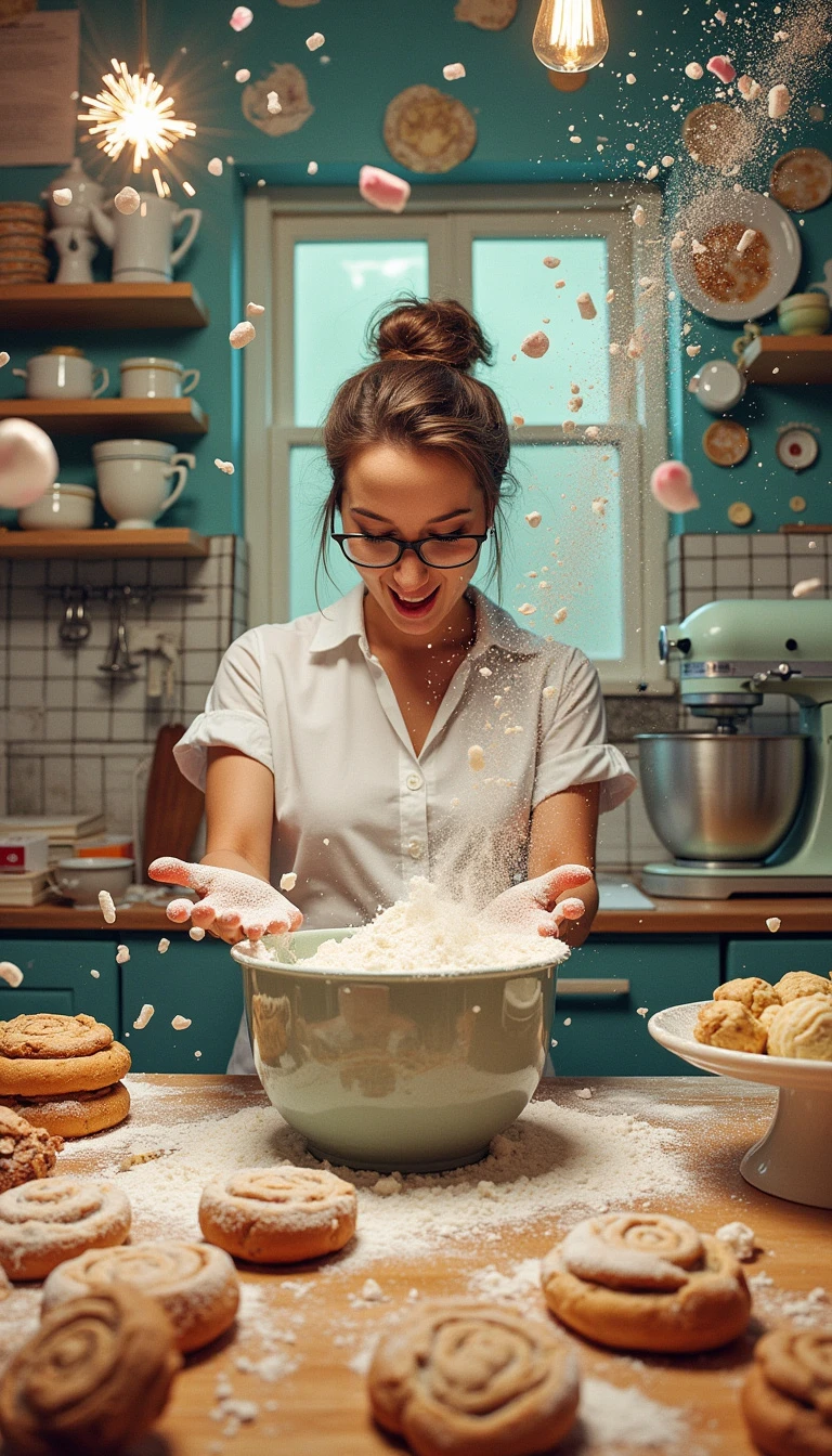 A hybrid scene blending the chaos of a busy kitchen with artistic flair, featuring a woman frantically baking, surrounded by an explosion of ingredients and desserts in progress. The vibrant colors of the flour, mixers, and cookbook contrast with the hyper-detailed textures of the cookies and cinnamon rolls. This dynamic image merges the real and whimsical, inspired by the photography of Daniel Krieger and the playful art style of Mary Blair. Captured with a Canon EOS R5 and a 24-70mm lens.