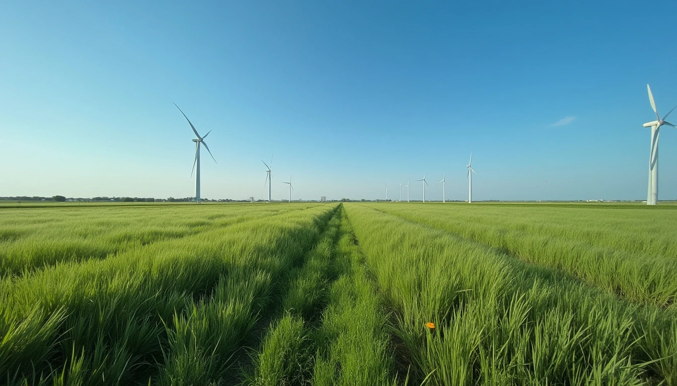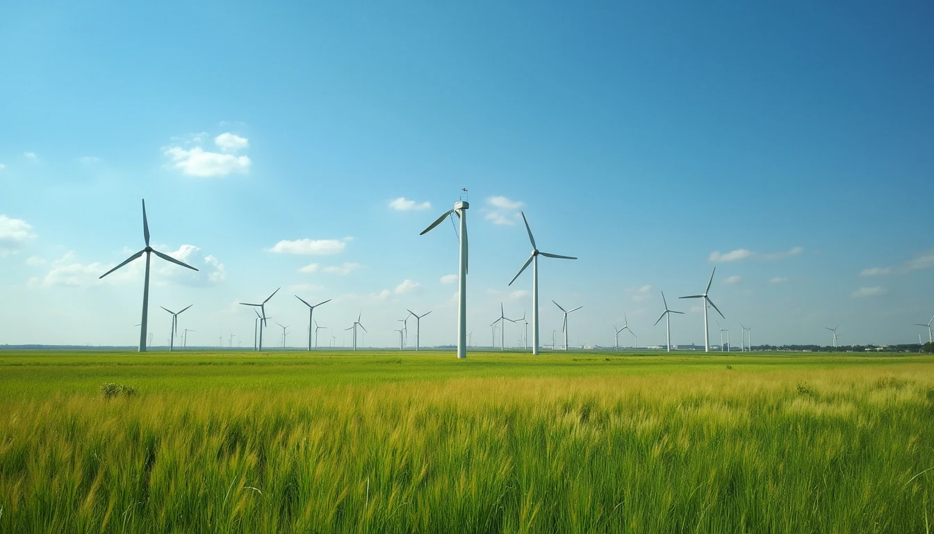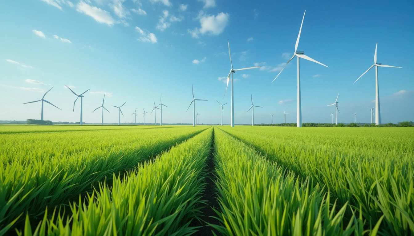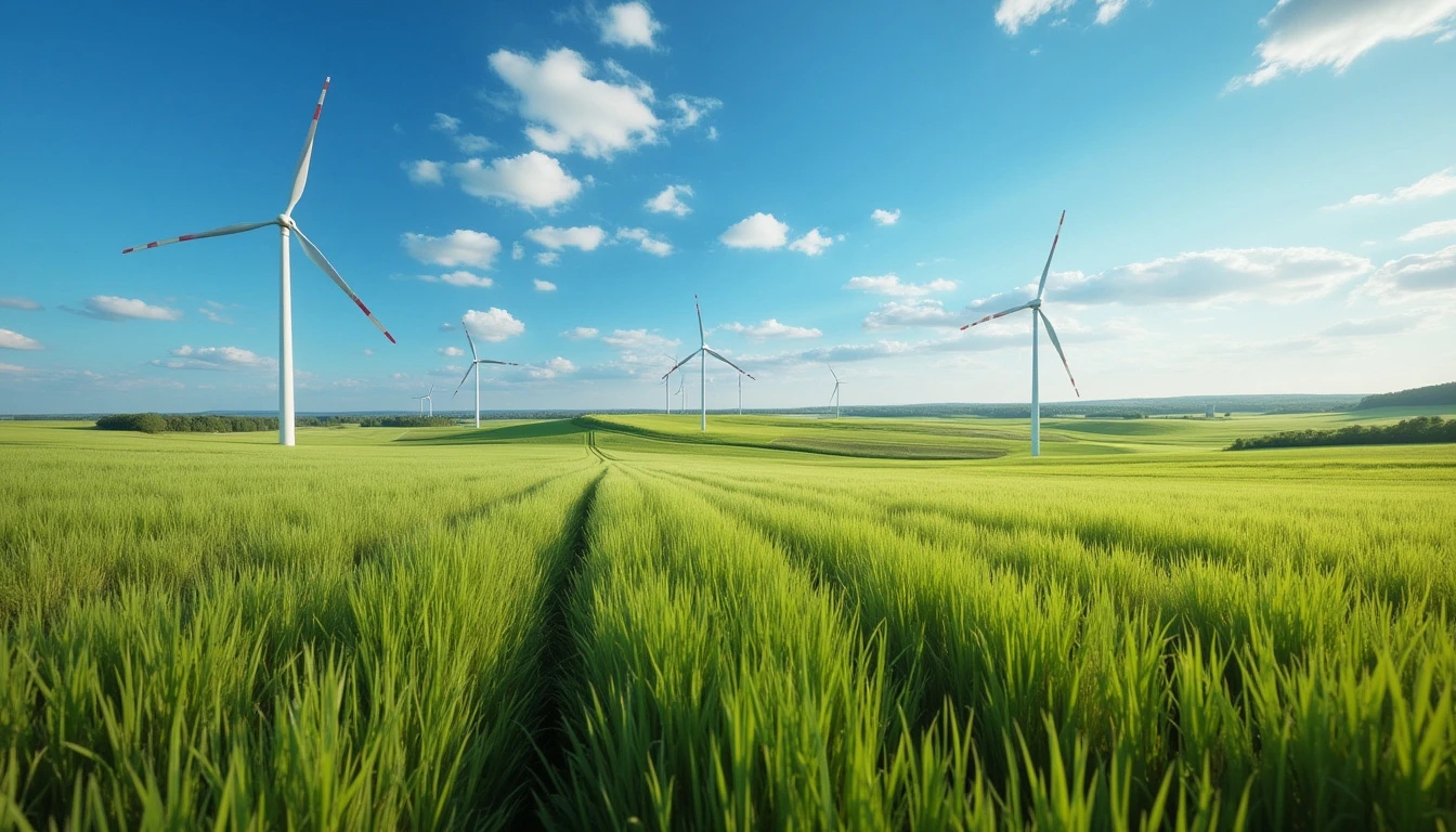 Blue sky and grass fields, in the distance there are windmills