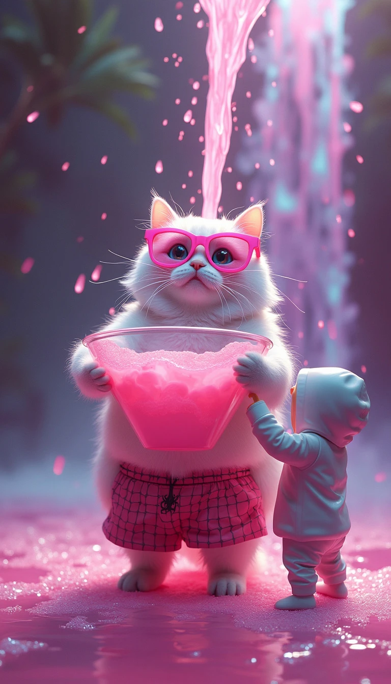 happy face chubby fluffy white cat with big, innocent blue eyes, wearing pink sunglasses and bright pink shorts with a Spiderman belt, stands near a bright pink waterfall. In its paws, it holds a large transparent cup filled with bright neon liquid poured from above, flowing like a waterfall behind it. A small hooded figure in white assists in pouring the giant cup. The scene is bathed in bright neon colors, creating a surreal and magical atmosphere, enhanced by soft lighting for a dreamlike quality. Hyperdetailed, realism, blurry background, incredible composition, dynamic lighting, meticulously composed concept art, masterpiece, mystic fog, digital illustration, volumetric lighting.
