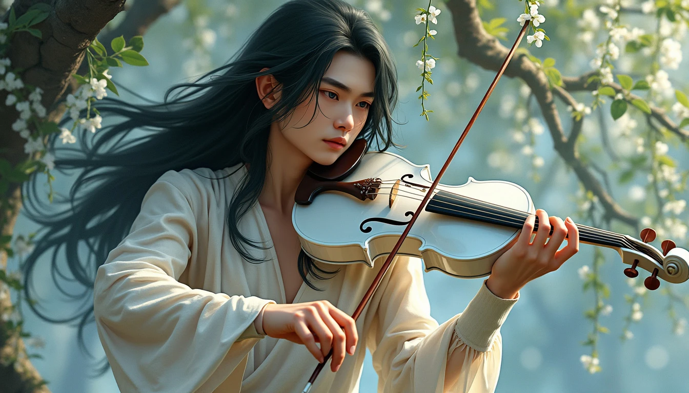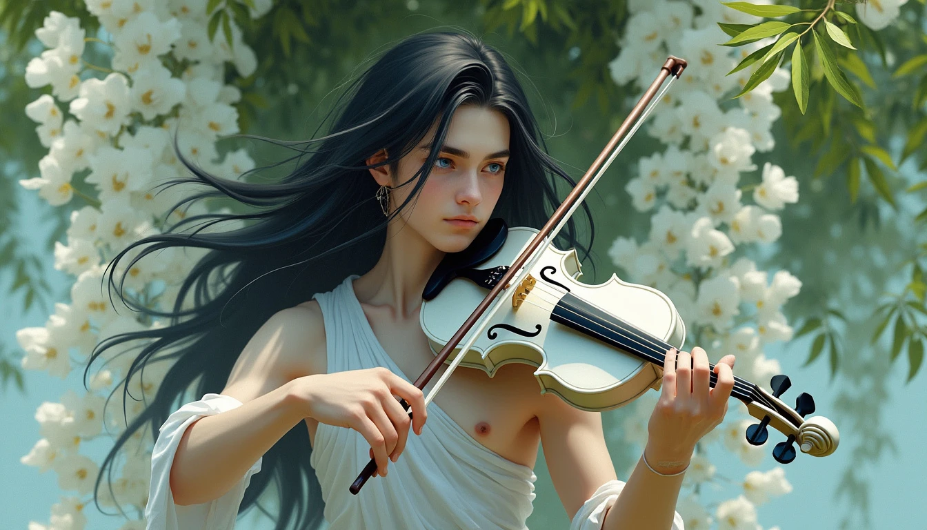 Handsome young man, 22 years old, long black hair, blue eyes, pale skin,has liny muscle, wearing white tussecls, playing a white futuristic violin under a tree with white flower tendrils and green leaves.