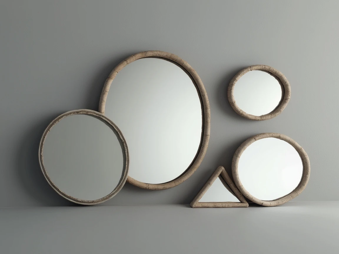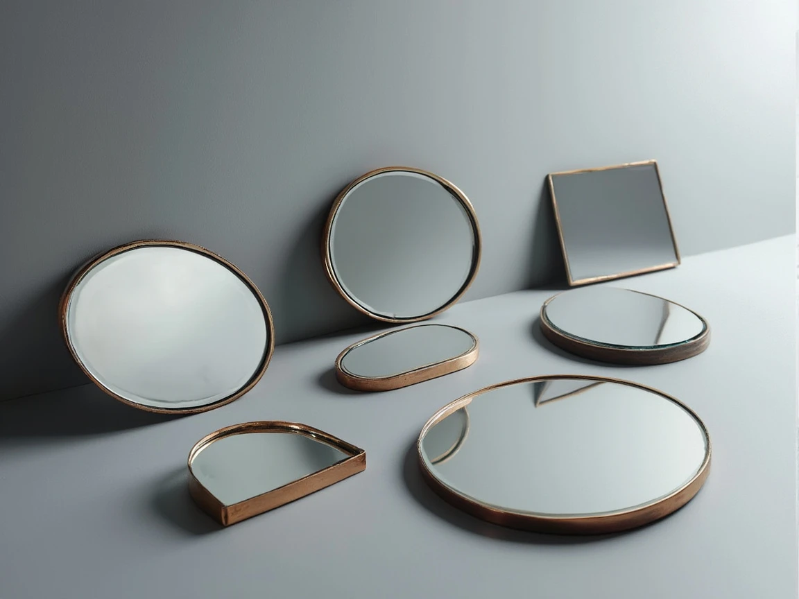 commercial photography of mirrors; 1 round, 1 oval, 1 square, 1 rectangular and 1 irregular shape mirror, studio light on simple grey background