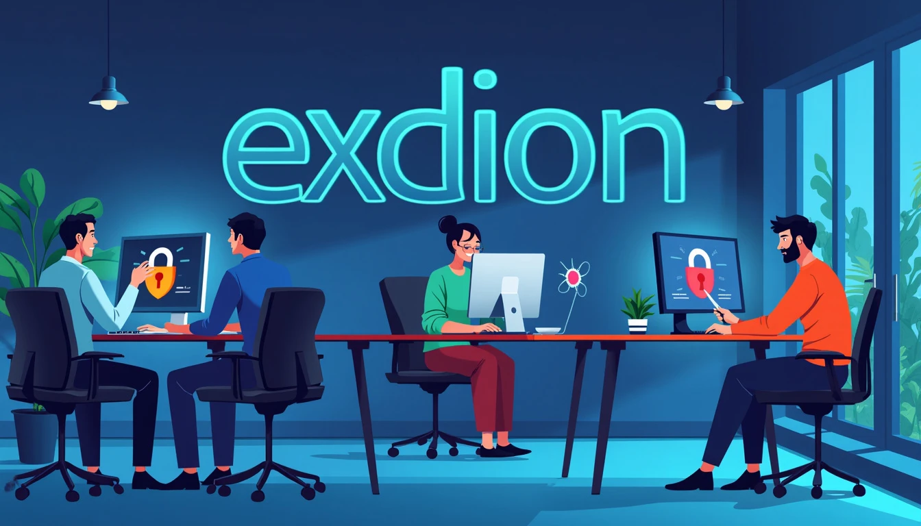 "A vector-style illustration showing an office environment where every employee at 'Exdion' is actively contributing to maintaining security. The office background is clean and modern, with minimalism desks, computers, and abstract office elements. In the foreground, employees are engaging in various security practices—one is locking their workstation, another is using two-factor authentication, and another is reporting a phishing email. The text 'EXDION' is displayed prominently in bold, modern font, either in the background or subtly integrated into the office setting. The color scheme uses professional shades of blue and gray, with security elements highlighted in neon accents like green, red, and orange to emphasize the critical role each employee plays in keeping the company secure."