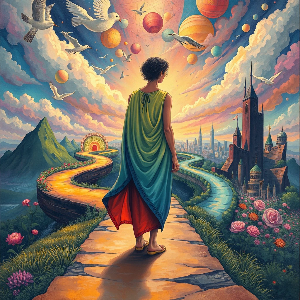 A striking surreal illustration of a person standing at a crossroads, with multiple paths branching out into fantastical landscapes. Each path represents a different mindset: one leads to a bright, flourishing garden; another to a chaotic cityscape filled with abstract shapes and colors. The figure, dressed in a flowing garment that shifts hues, looks contemplatively at the paths before them. Above, a sky filled with whimsical birds and geometric shapes symbolizes the power of choice and creativity. The entire scene is painted in rich, saturated colors, invoking a sense of wonder and exploration of the mind.