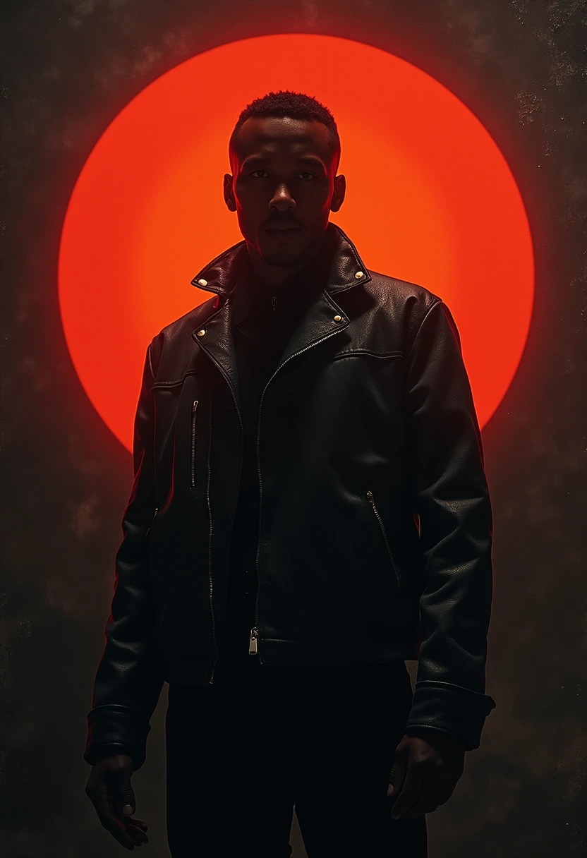 A stylized, cinematic poster featuring a silhouetted figure in a textured jacket against a vivid red-orange halo-like glow, set against a dark, grainy background, evoking a dramatic and mysterious atmosphere