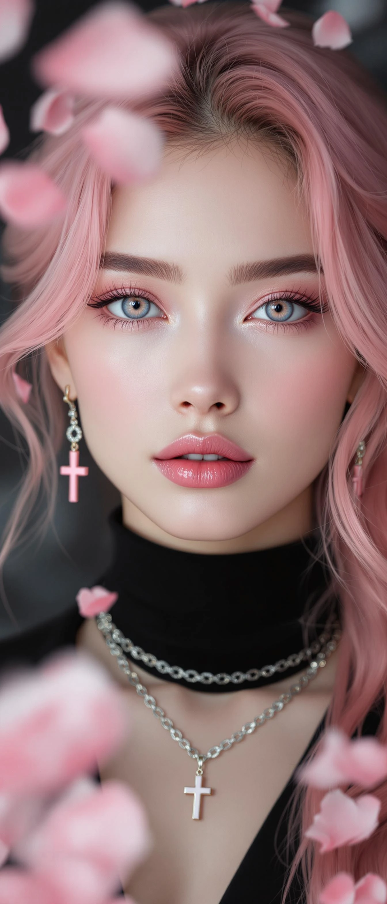 Ultra-close-up portrait of an ethereal 21-year-old woman with breathtaking beauty. She has flawless alabaster-white skin that radiates softness and purity. Her delicately arched eyebrows display a strikingly rare shade of pastel pink, an unusual and captivating hue that enhances her otherworldly presence. Perfectly framing her mesmerizing eyes, they harmonize with her strikingly rare pink irises—an atypical and almost supernatural color that stands out against her naturally pure white sclera. Whether a genetic marvel or enhanced by custom pink contact lenses, her eyes possess an unparalleled allure. Her long, voluminous eyelashes further intensify her hypnotic gaze. She has a small, delicate nose and full, glossy pink lips that are slightly parted, revealing perfectly aligned white teeth. Her soft pink hair cascades gracefully, complementing her delicate facial features with a silky, flowing texture. She wears a high-necked black blouse, creating a dramatic contrast against the dominant pink tones. A silver chain necklace adorned with an elegant pink crucifix rests delicately on her collarbone, while matching pink crucifix dangle earrings add a subtle yet symbolic detail. Her gaze is direct yet serene, exuding an aura of confidence and calmness. The composition is a hyper-detailed extreme close-up shot, with a background transitioning from deep black to a soft grey gradient, enhancing depth and contrast. Soft pink petals descend gently from the sky, introducing a poetic and dreamlike atmosphere. The color palette is predominantly delicate shades of pink, subtly contrasted by the black and silver elements of her outfit. The lighting is soft and perfectly balanced, accentuating the vibrancy and femininity of the pink tones while maintaining an exceptionally detailed and photorealistic finish. The final image is an award-winning masterpiece, celebrated for its harmonious composition, emotional depth, and exquisite use of color. Ultra-realistic, high-resolution photography with soft and dramatic lighting. Extreme close-up shot, direct angle. Shallow depth of field, focusing sharply on the subject’s face while keeping the background and petals softly blurred. The mood is feminine, graceful, elegant, and dreamy