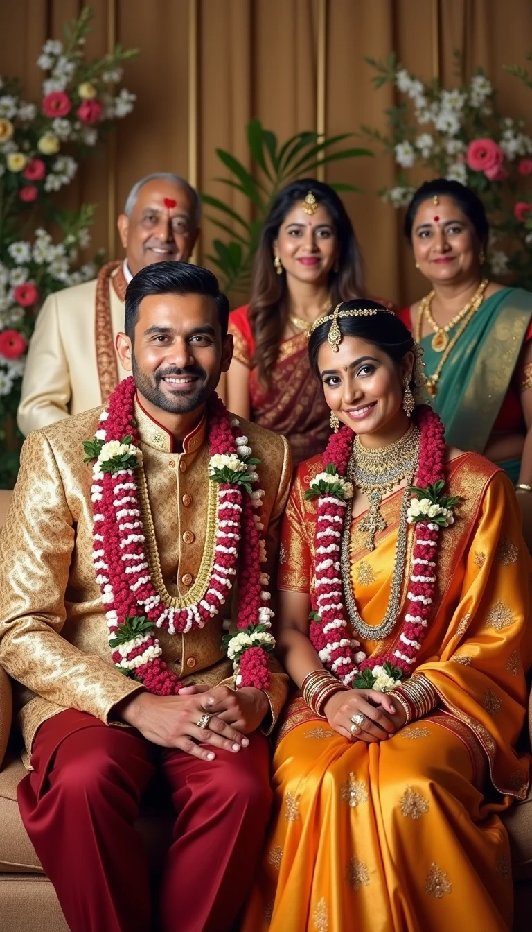 “A realistic high-resolution wedding portrait photo of an Indian family in traditional attire. Two couples (bride and groom) in front wearing saree and sherwani, adorned with jewelry and garlands. The parents of the groom sitting on a sofa, dressed traditionally. The background has floral decorations, warm lighting, and a celebratory atmosphere. Everyone is smiling and facing the camera. Indoor studio setup with soft shadows.”