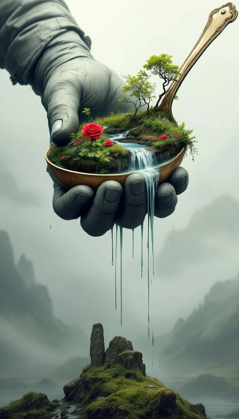 Create a surreal fantasy scene featuring a giant, weathered hand holding an oversized teaspoon. Inside the teaspoon, depict a lush miniature landscape with a red rose blooming garden and a flowing waterfall cascading from the teaspoon into the hand. Use a misty, ethereal background with muted gray and green tones to enhance the dreamlike atmosphere. Include subtle details like dripping water and rocky terrain at the base.
