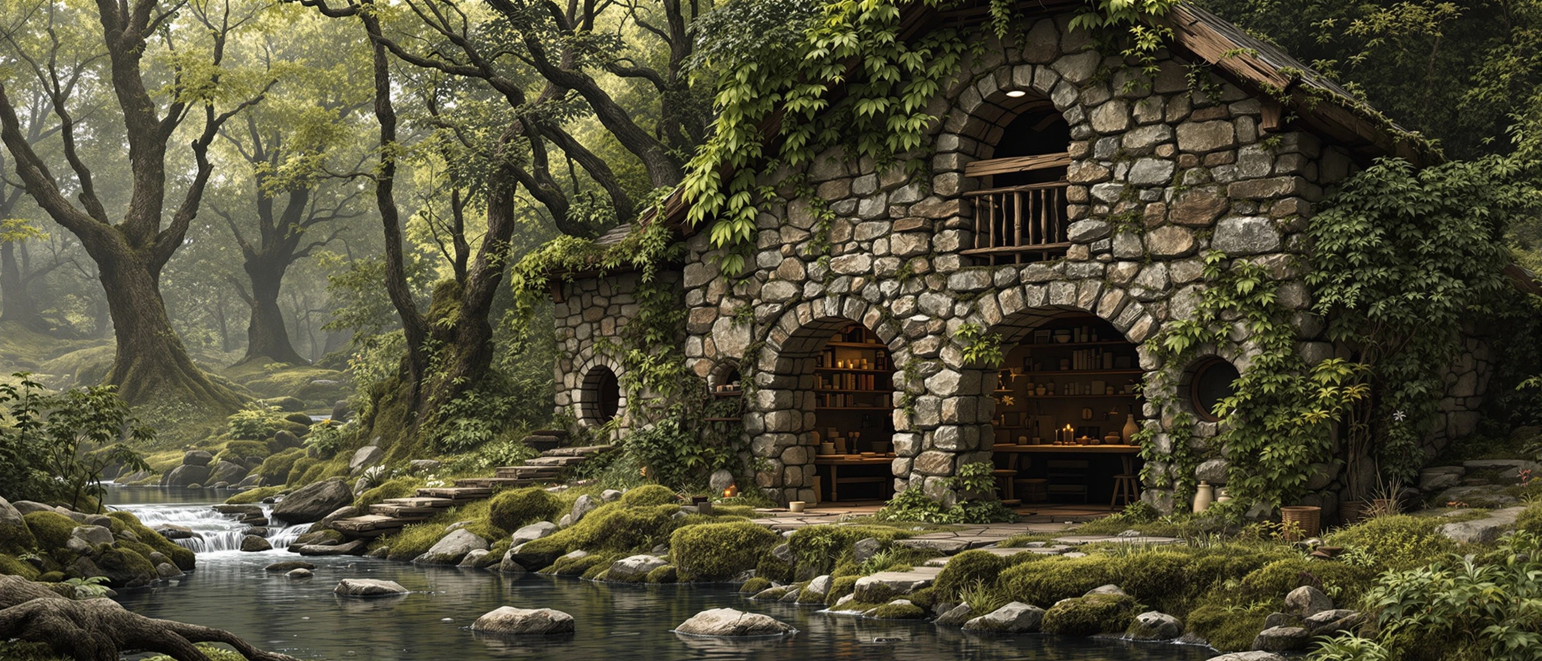 small post-apocalyptic off-grid homestead dwelling, rustic stone cottage built by hand, simple and minimal scale, nestled beside a quiet stream in a secluded grove, thick uneven stone walls with visible repairs, moss and climbing plants integrated naturally into the structure, no modern materials ground floor interior visible through open doorway: simple sleeping area, small kitchen hearth, wooden communal table used for meals and crafts, handmade tools and pottery, lived-in but orderly upper level loft or small study with a single bookshelf, chair and table, candles and oil lamp, narrow balcony or window overlooking water environment feels quiet, practical, and harmonious with nature, no fantasy elements, no modern architecture, no symmetry, muted earth tones, soft diffuse daylight, natural textures, sense of long-term survival and calm continuity cinematic but restrained realism, tactile materials, believable scale, off-grid survival atmosphere