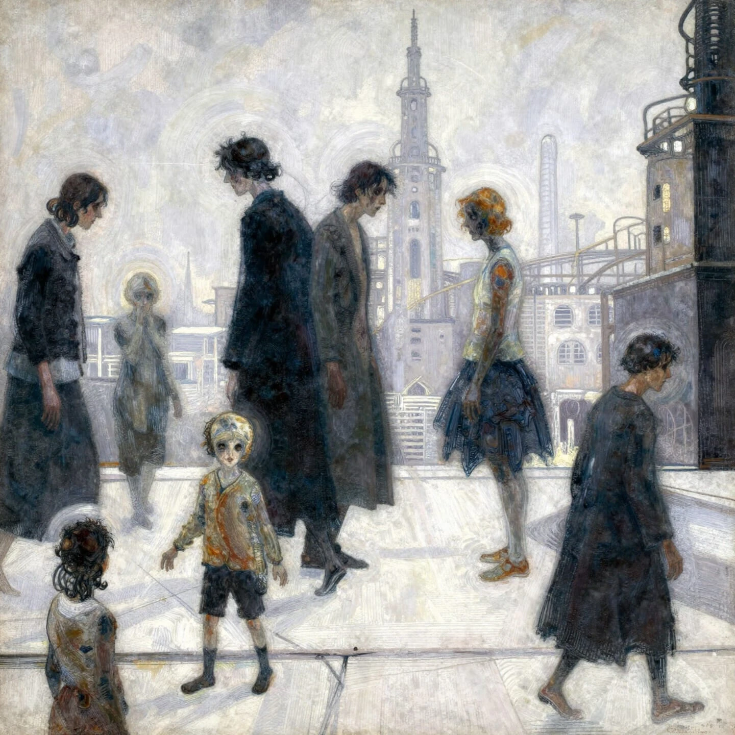 A street of four or five ghostly 1920's muted coloured sreaked memories drifting through space, stripped of detail down to emotional outlines. passing, standing and hesitating. No one is looking at another for too long. Lingering, persistent, muted memories of people rather than people themselves because loneliness, and collective isolation does not require solitude. industrial architecture is looming larger, not just physically but psychologically. Buildings are no longer just framing the human life; now they overshadow it. That unspoken symbolism of i modern life flattens emotional intensity, not by erasing feeling, but by dispersing it. Love happens, ceremonies occur, people gather yet unresolved feeling to remain. As if walking home from something important but not knowing whether to fieel relieved or grieving. , aidmafluxproultra, ArsMJStyle, impressionism, Oil painted, ral-dissolve