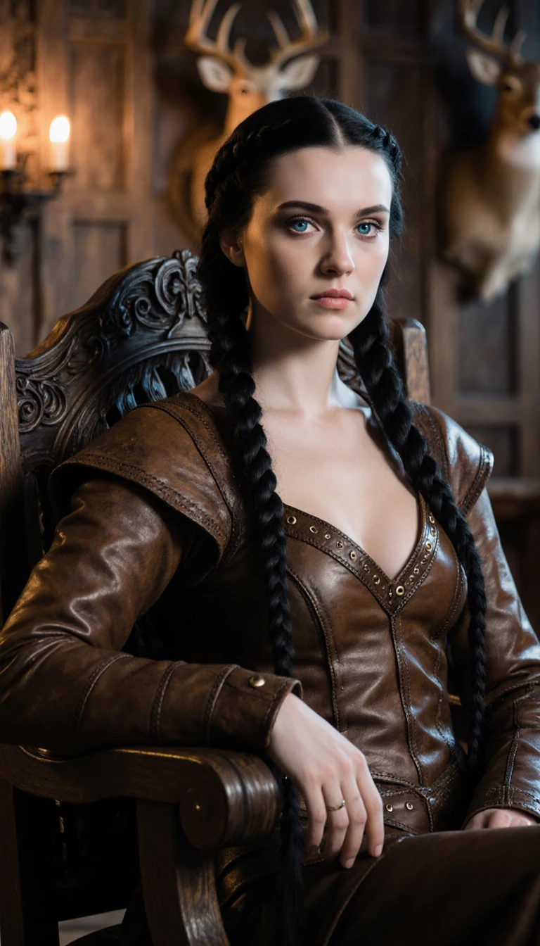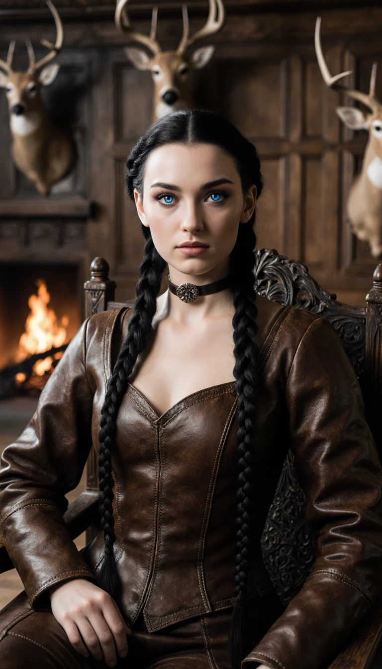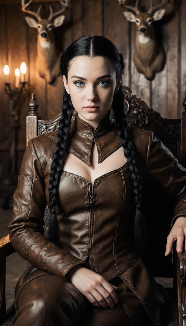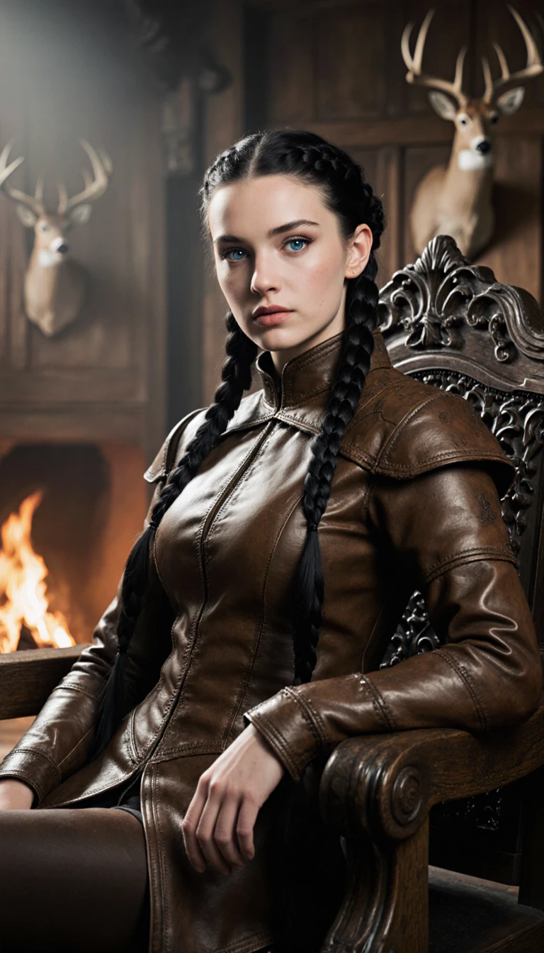 A cinematic, photorealistic portrait of a beautiful duke’s daughter in her early twenties, with rebellious grace and commanding presence. Her long black hair is tightly braided into two symmetrical plaits, her angular face marked by sharp cheekbones and icy sapphire-blue eyes that shine with cunning and pride. She wears a tailored leather hunting outfit, chestnut brown with weathered textures, accentuating her ample bust and athletic frame. The scene takes place in the hunting lodge of a medieval castle, firelight casting warm glows and shadows across her face, with mounted trophies and wood-paneled walls in the blurred background. Her posture is upright and relaxed, sitting on a carved oak chair, one elbow resting on the armrest, looking directly at the viewer. 35mm lens, cinematic contrast, soft ambient haze, high-definition detail on clothing seams and facial features, evoking a scene from a fantasy epic.