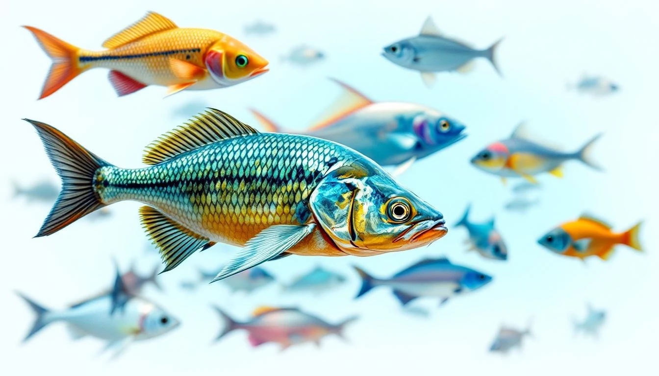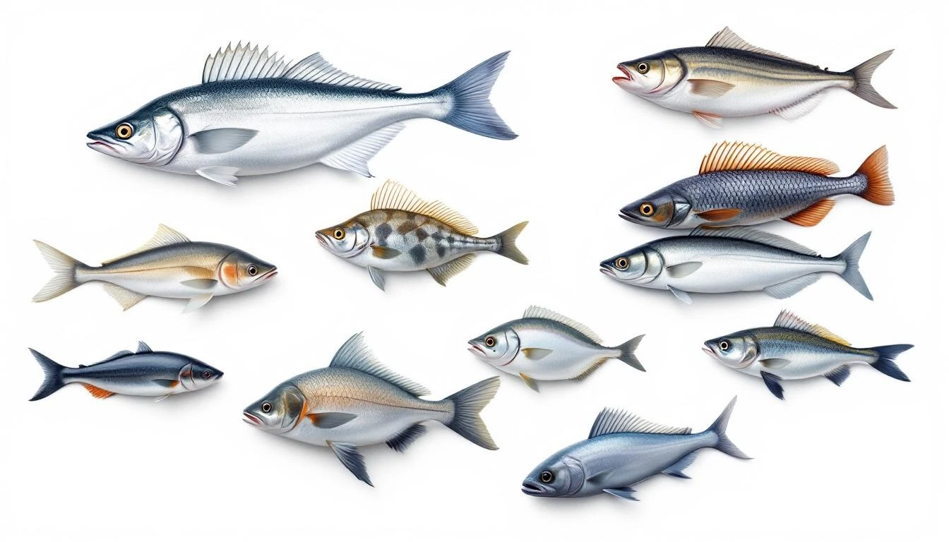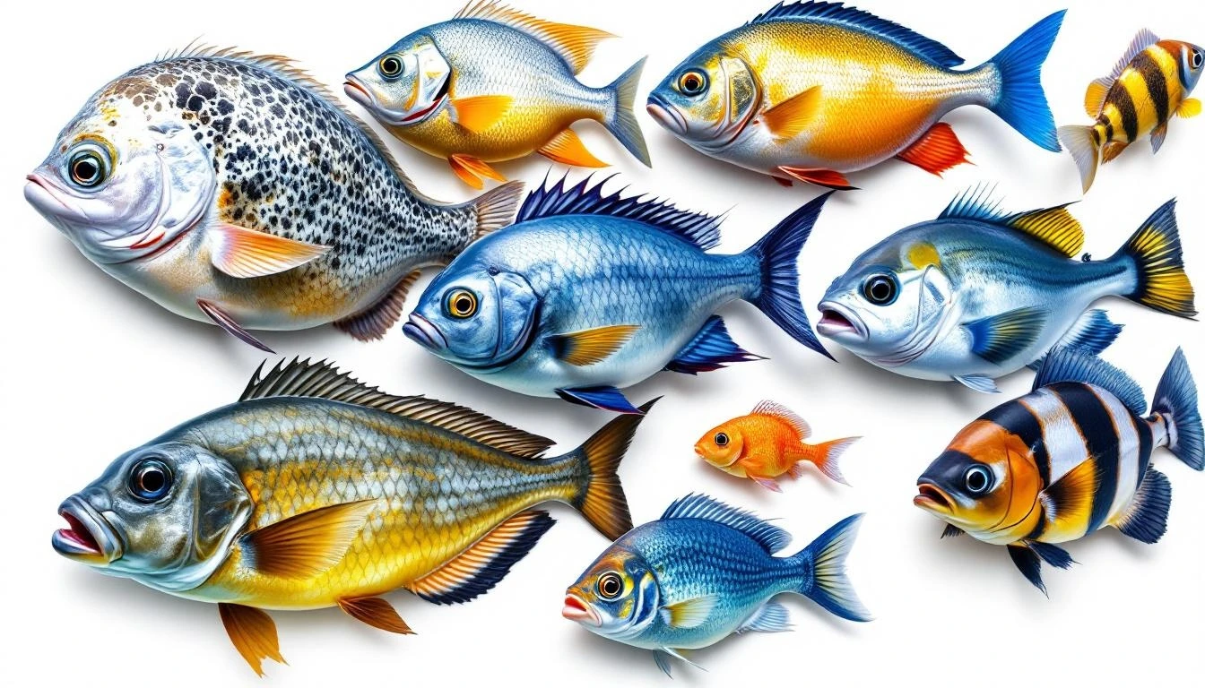 Generate an image with multiple realistic, highly detailed, aquatic fish only, on a white background.
