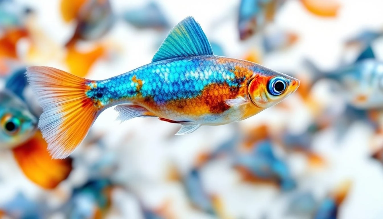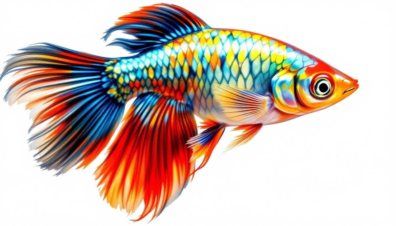 Generate an image with realistic, highly detailed, guppies fish, on a white background. The fish must not overlap eachother