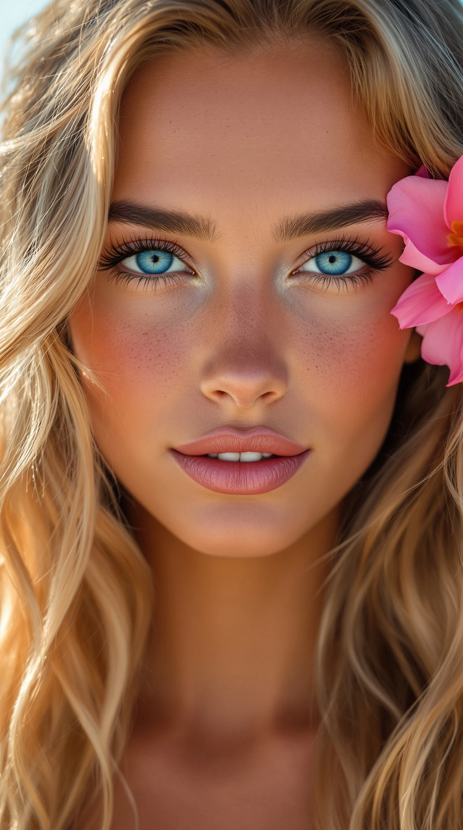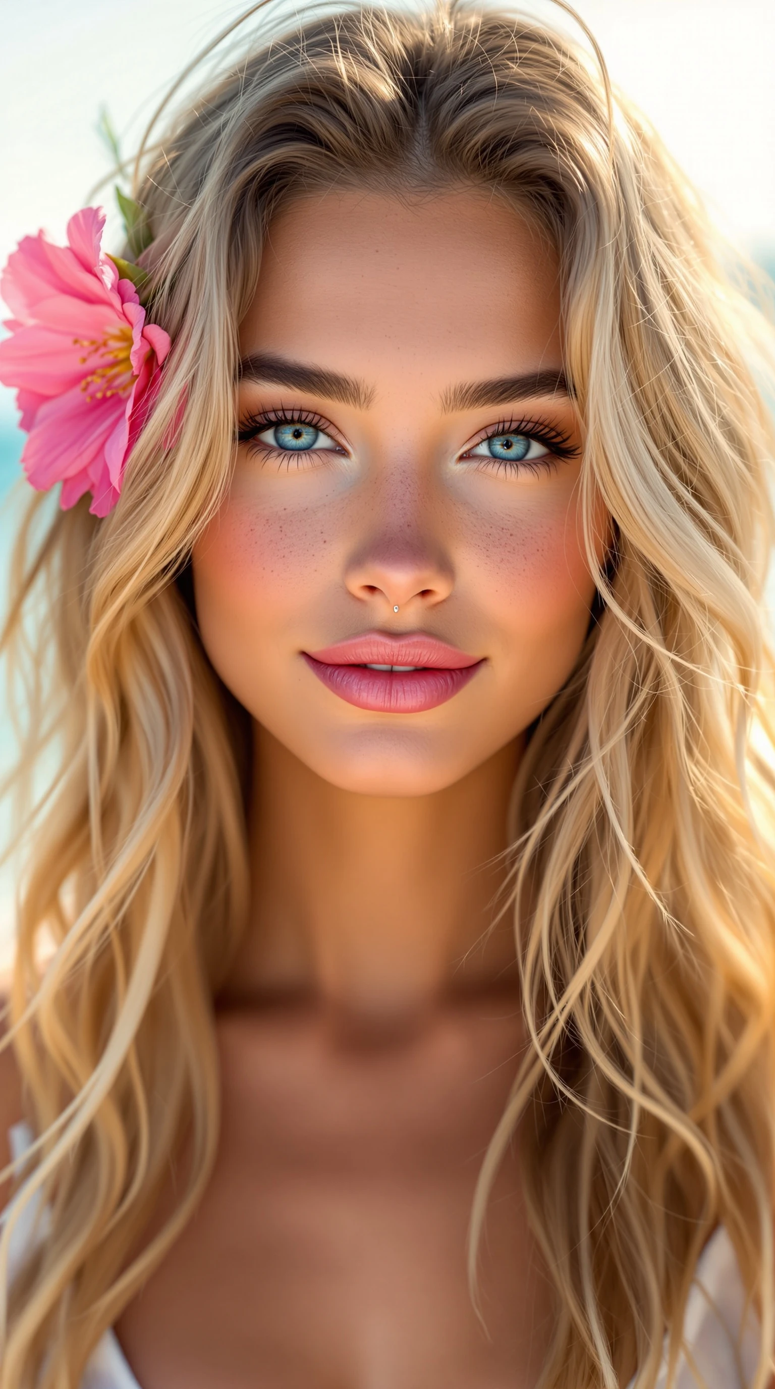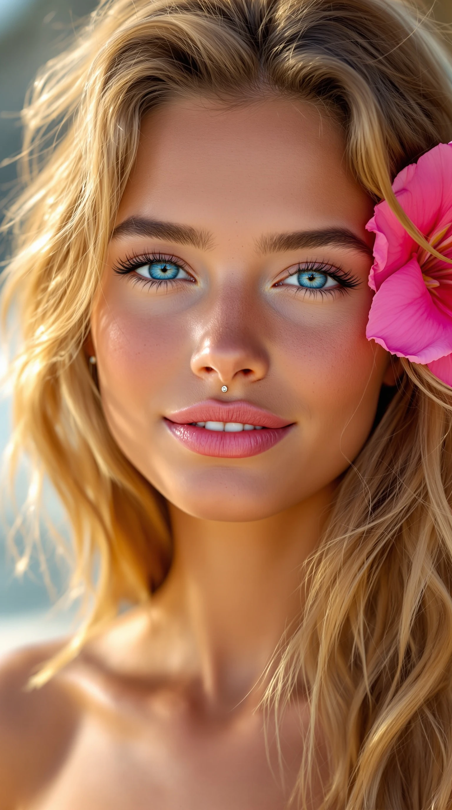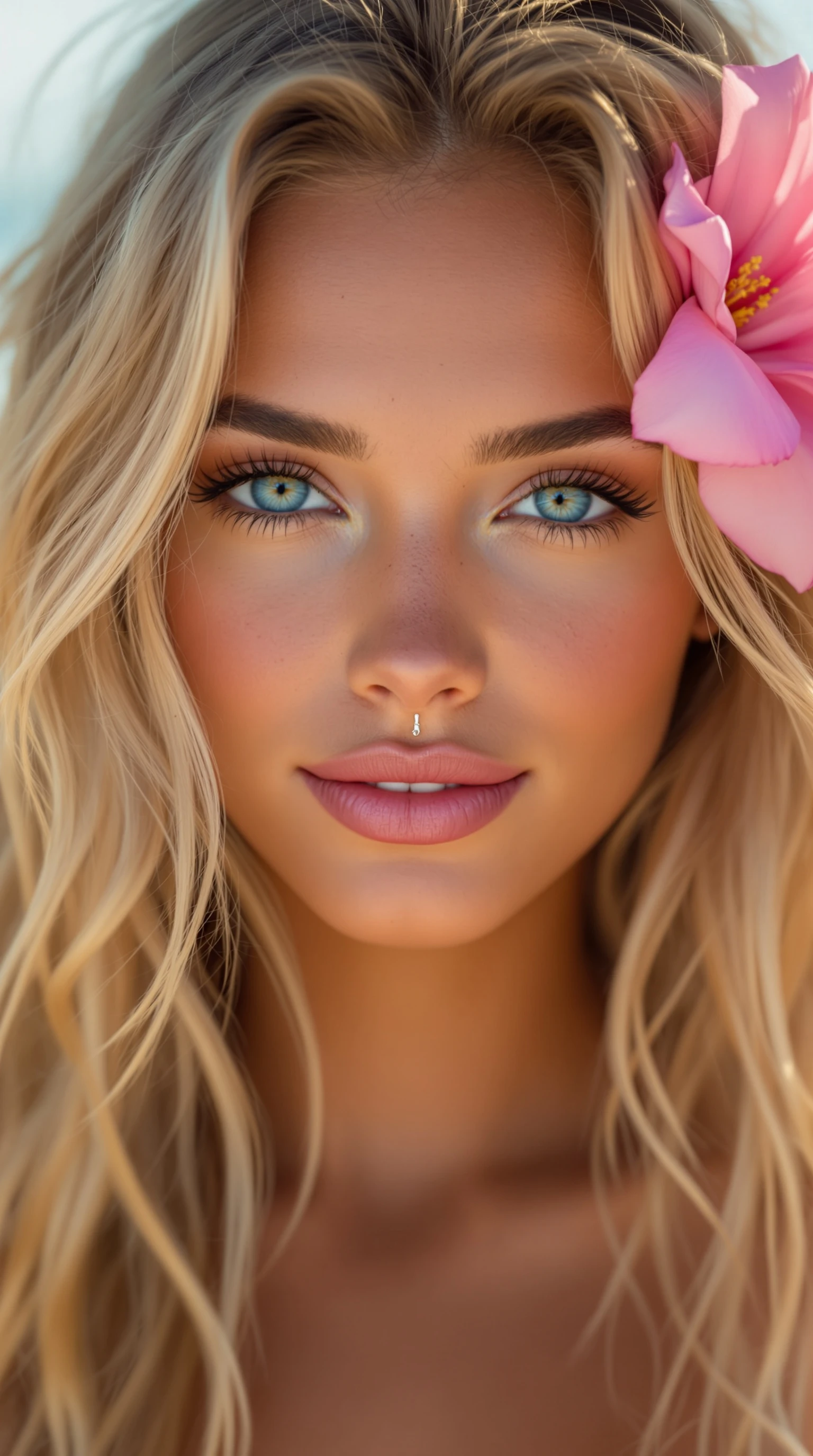 Photorealistic close-up portrait of a stunning 23-year-old woman with long wavy sun-kissed blonde hair, large bright blue eyes, subtle natural makeup, glossy pink lips, light tan glowing skin, small silver septum nose piercing, soft symmetrical face with high cheekbones and full lips, warm confident expression with a gentle smile, large vibrant pink flower tucked into her hair on one side, bohemian beach girl aesthetic, golden hour sunlight, soft ocean background blur, highly detailed skin texture with natural pores and freckles, cinematic lighting, sharp focus, 8k, ultra-realistic, professional photography, Canon EOS R5, 85mm lens, f/1.8, natural bokeh --ar 2:3 --v 6 --q 2 --stylize 250